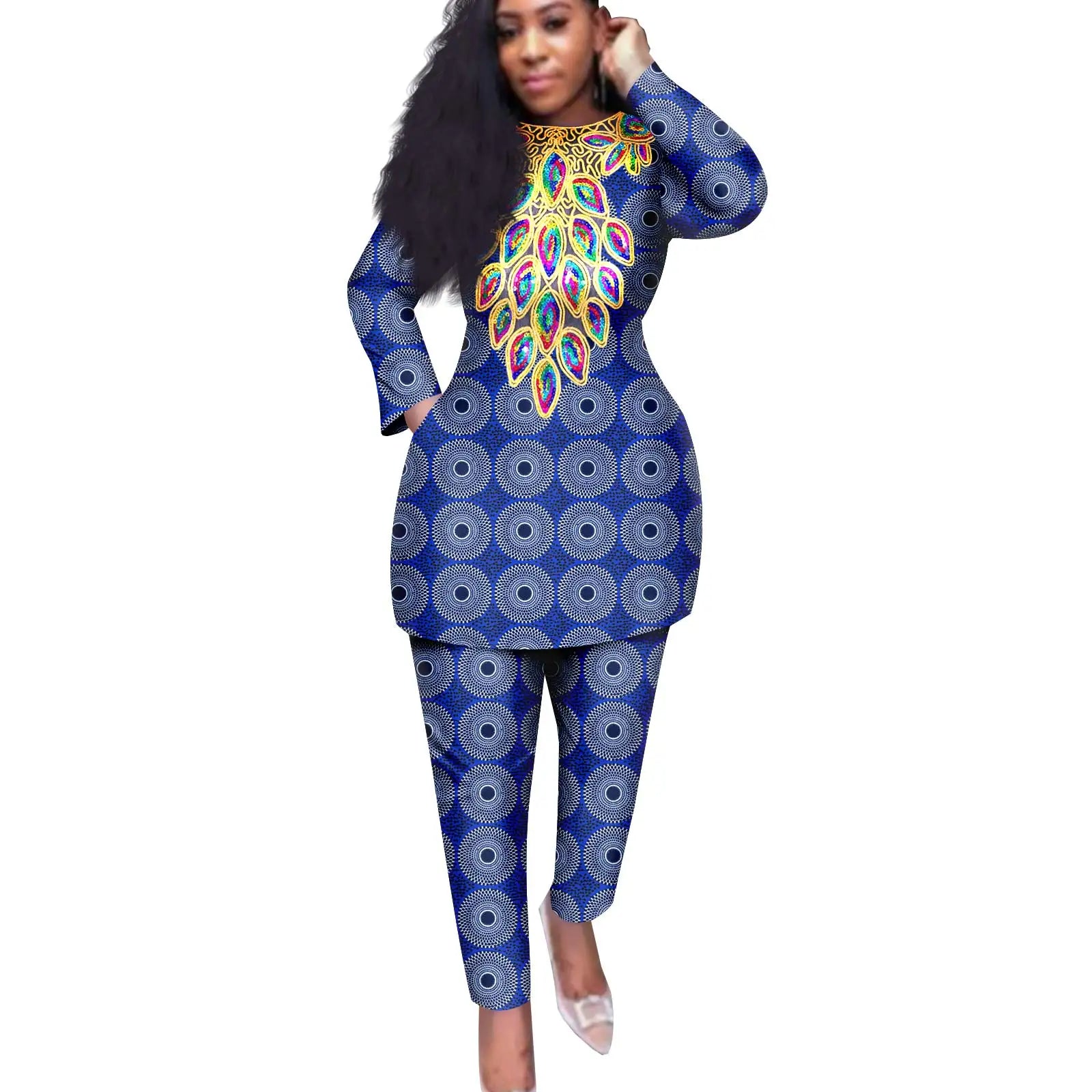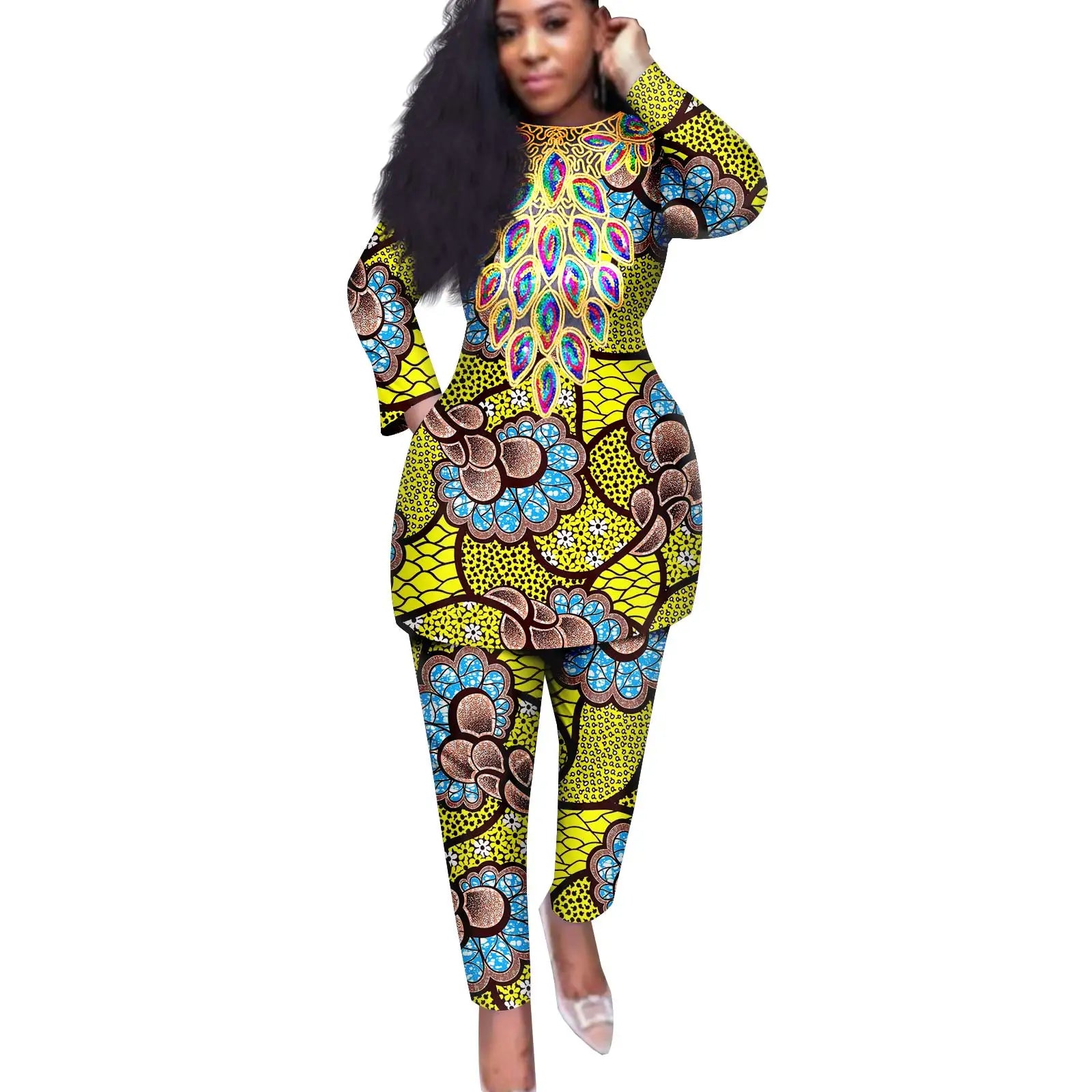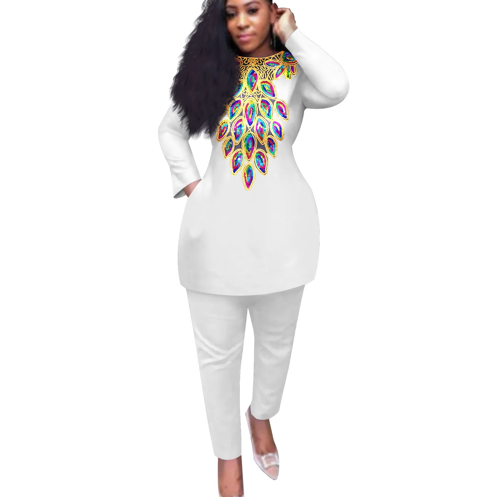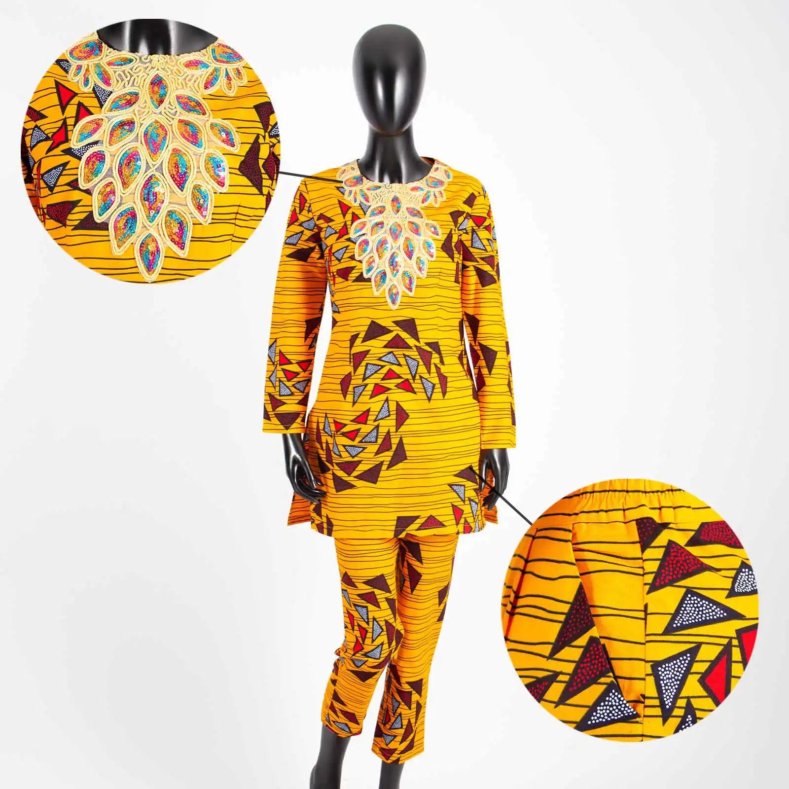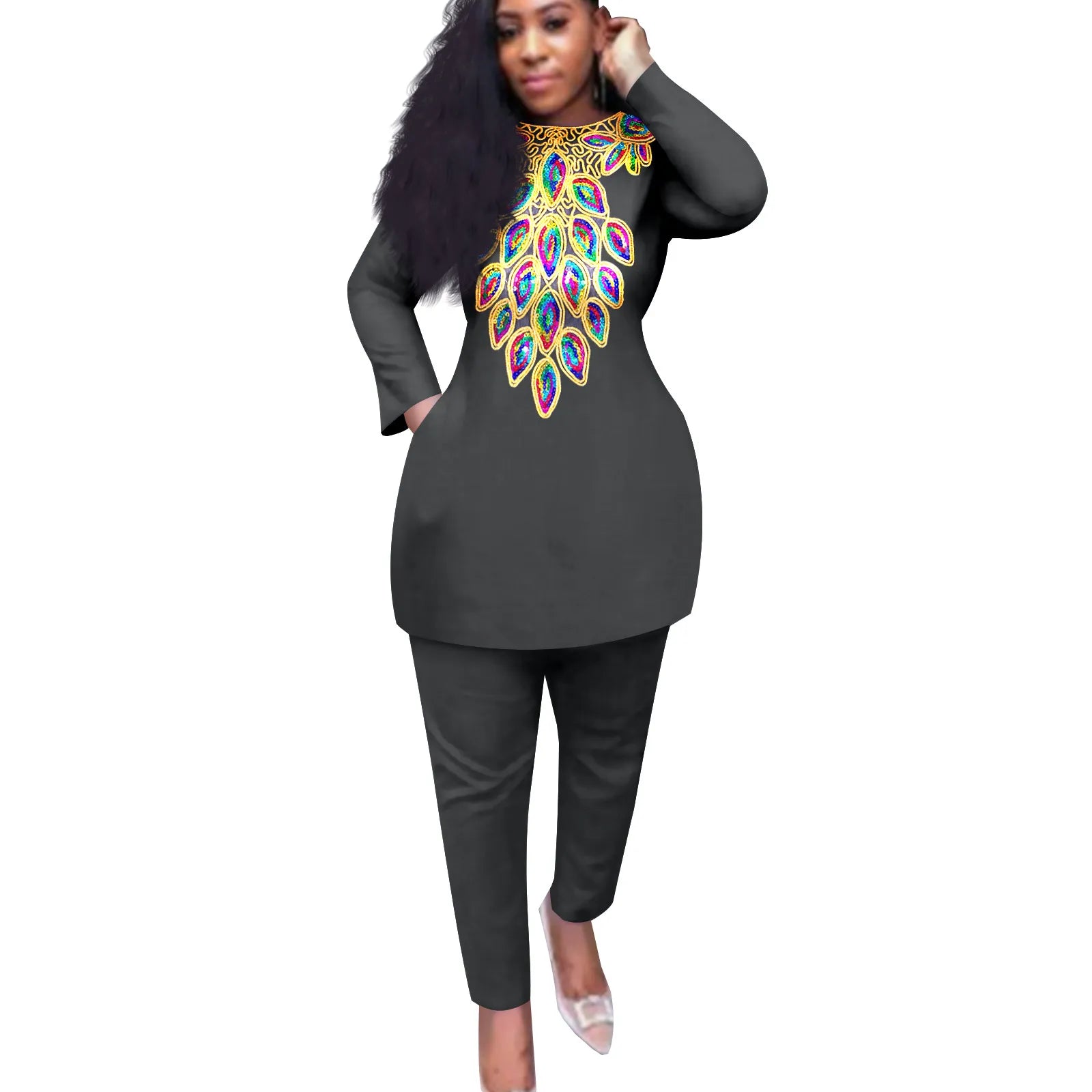 African American Women's Printed Fabric Top with Pants, Dazzling Stamping Set, Long Sleeve, Plus Size, Fashion, A2226026