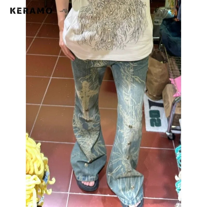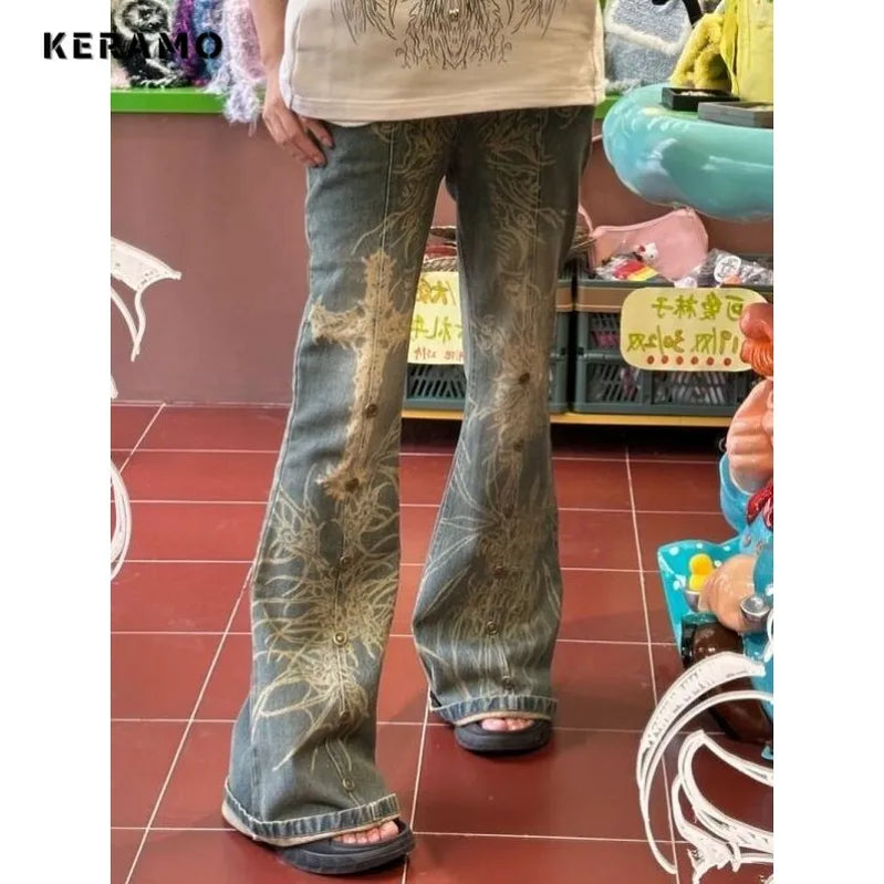 Americano vintage cintura alta estilo de rua azul calças jeans retas femininas perna larga impressão baggy y2k retro denim calças