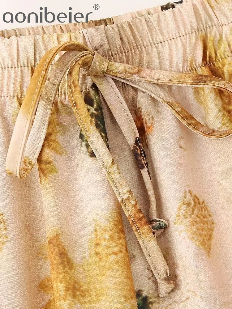 Aonibeier Conjunto de camisa solta feminina estampada em cetim fino, blusa casual de manga comprida e calças largas para verão, Y2K