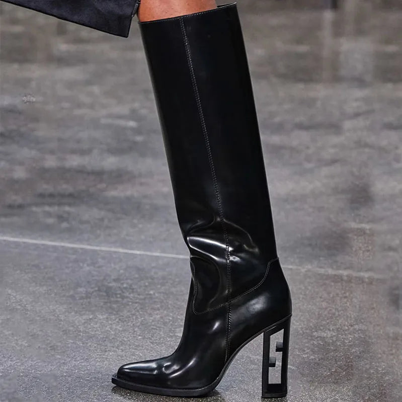 Arden Furtado Botas femininas de couro até o joelho, com salto grosso e vazado, botas de montaria da moda, botas marrons de cano alto para mulheres