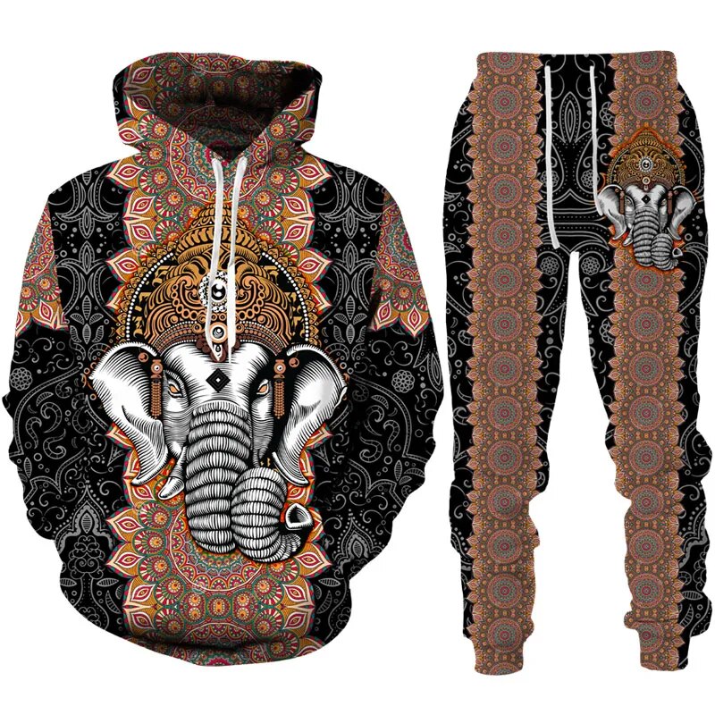 Outono e inverno masculino 3d elefante impressão calças com capuz terno casual jogging conjunto de roupas masculino agasalho pulôver moda terno masculino