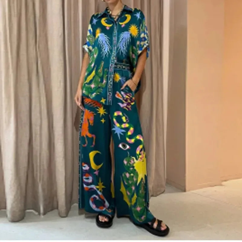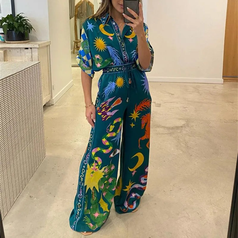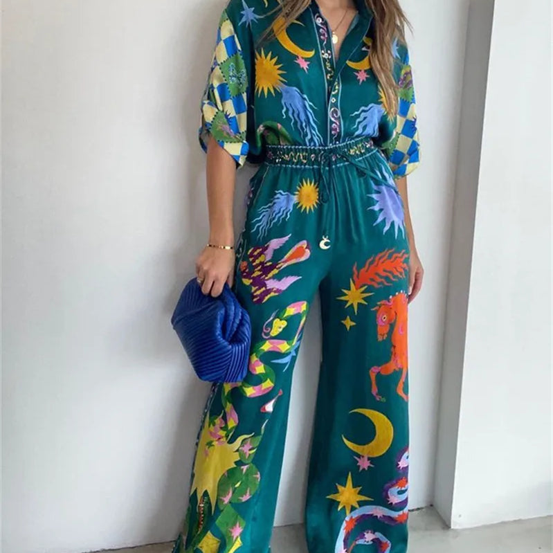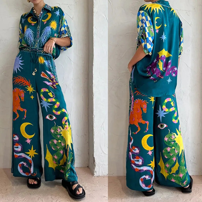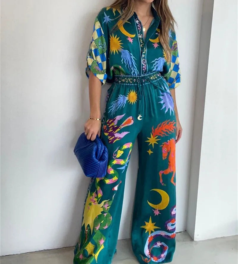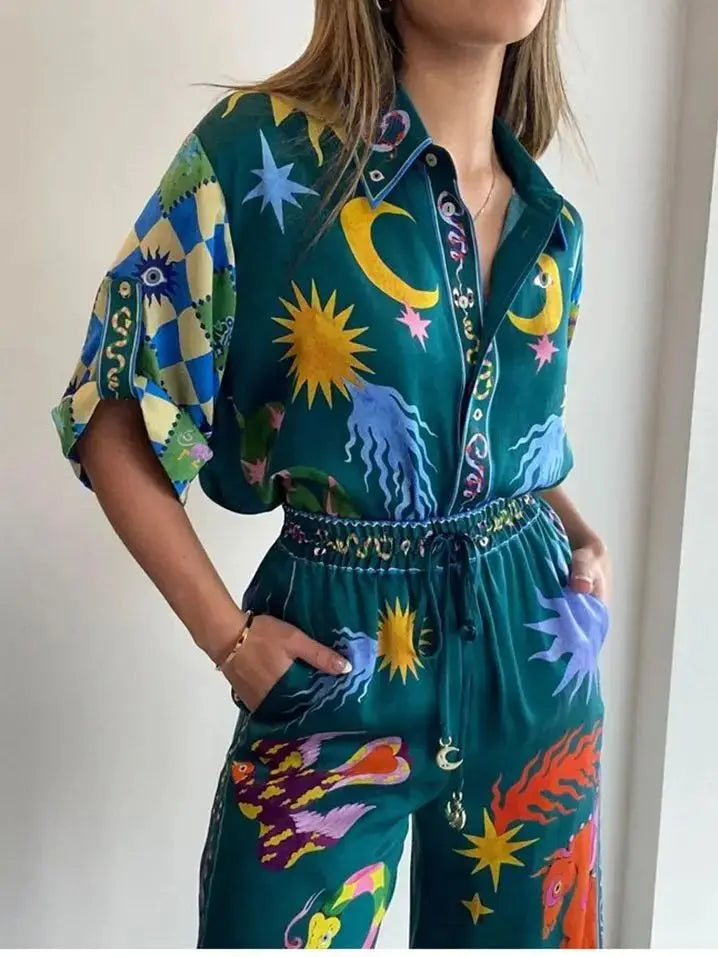 Outono dos desenhos animados impressão calça terno feminino elegante turn down colarinho camisas + solto calças de perna larga 2 peças define roupas femininas