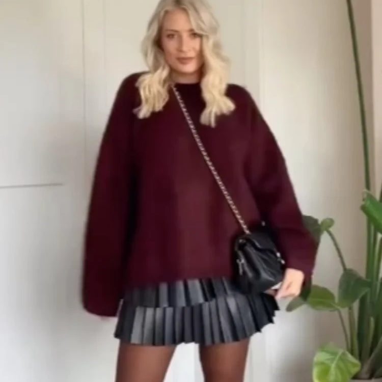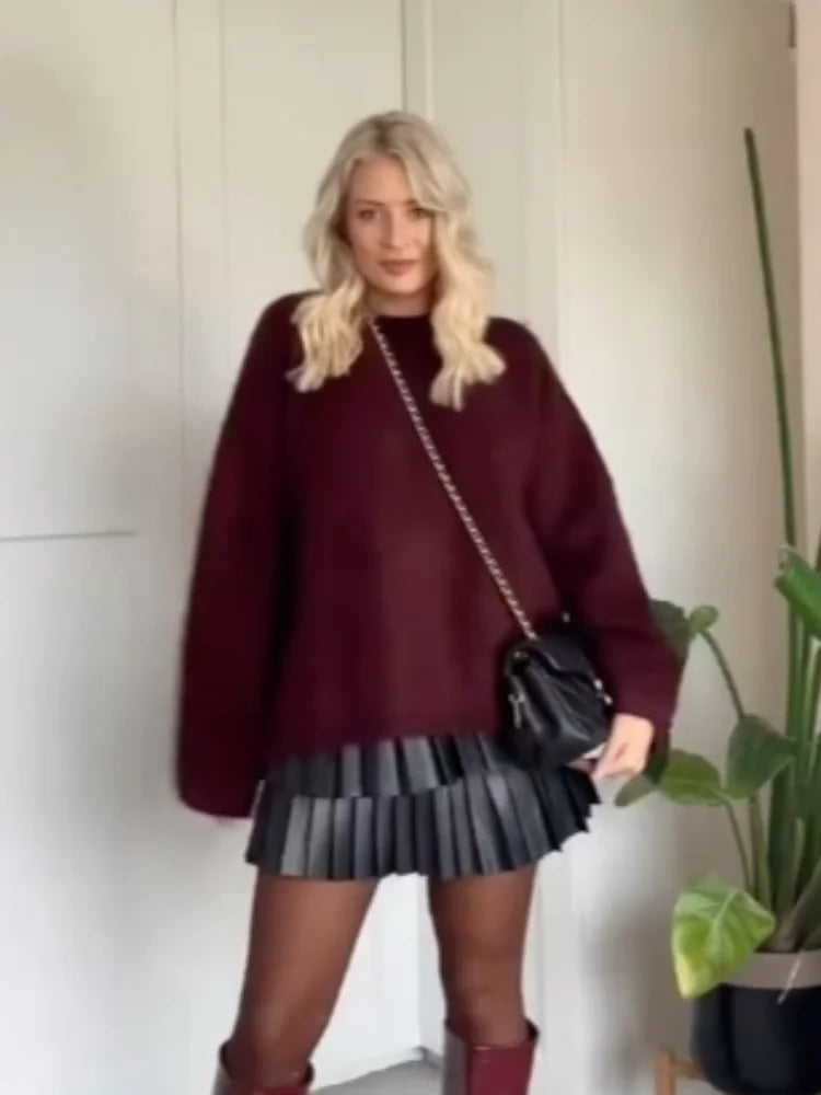 Outono malha fúcsia cor sólida mulher elegante suéter pulôver moda solto gola redonda manga comprida suéteres diários