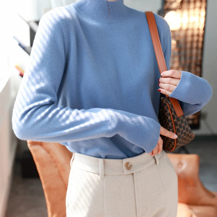 Suéteres chiques de outono e inverno para mulheres, pulôver de gola alta, slim, manga comprida, suéter de malha, macio e quente, blusa feminina
