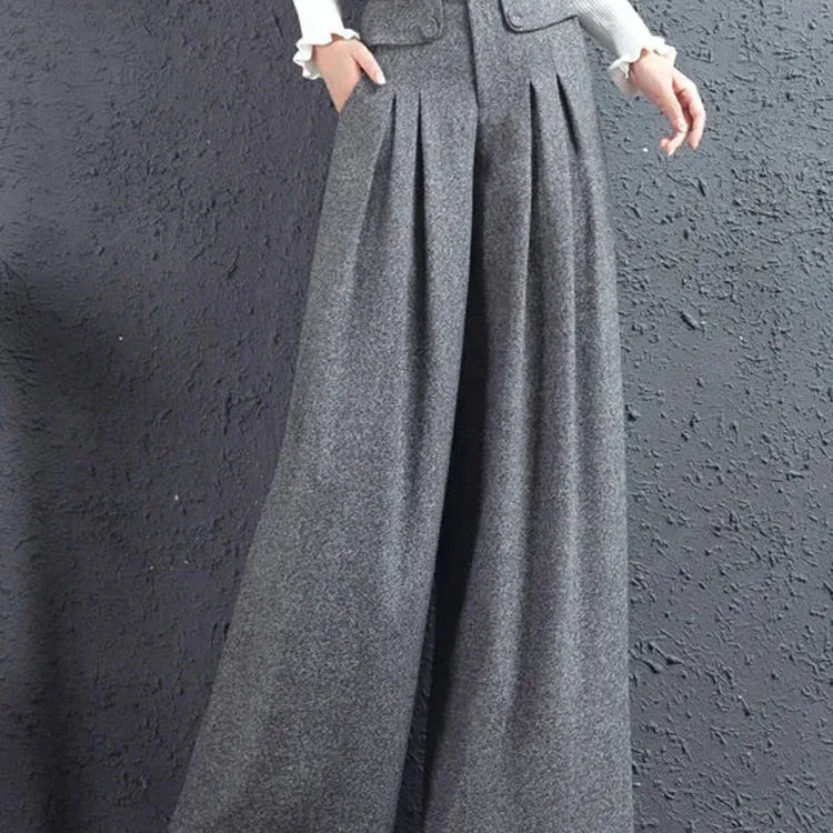 Calças femininas largas de lã misturada outono inverno culotte elegante cintura alta cinto perna larga pantalones moda coreana calças grandes