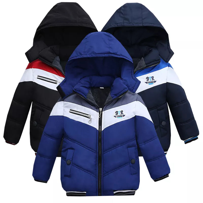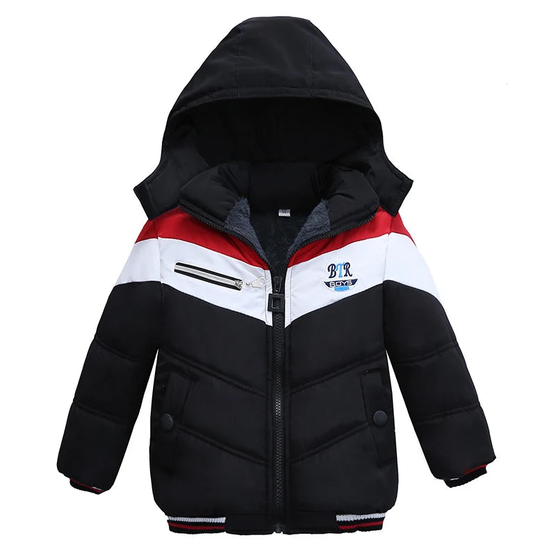Bebê menino inverno jaqueta de algodão carta impressão mais veludo quente com capuz acolchoado casaco engrossado 2-5 anos de idade beibei roupas de qualidade