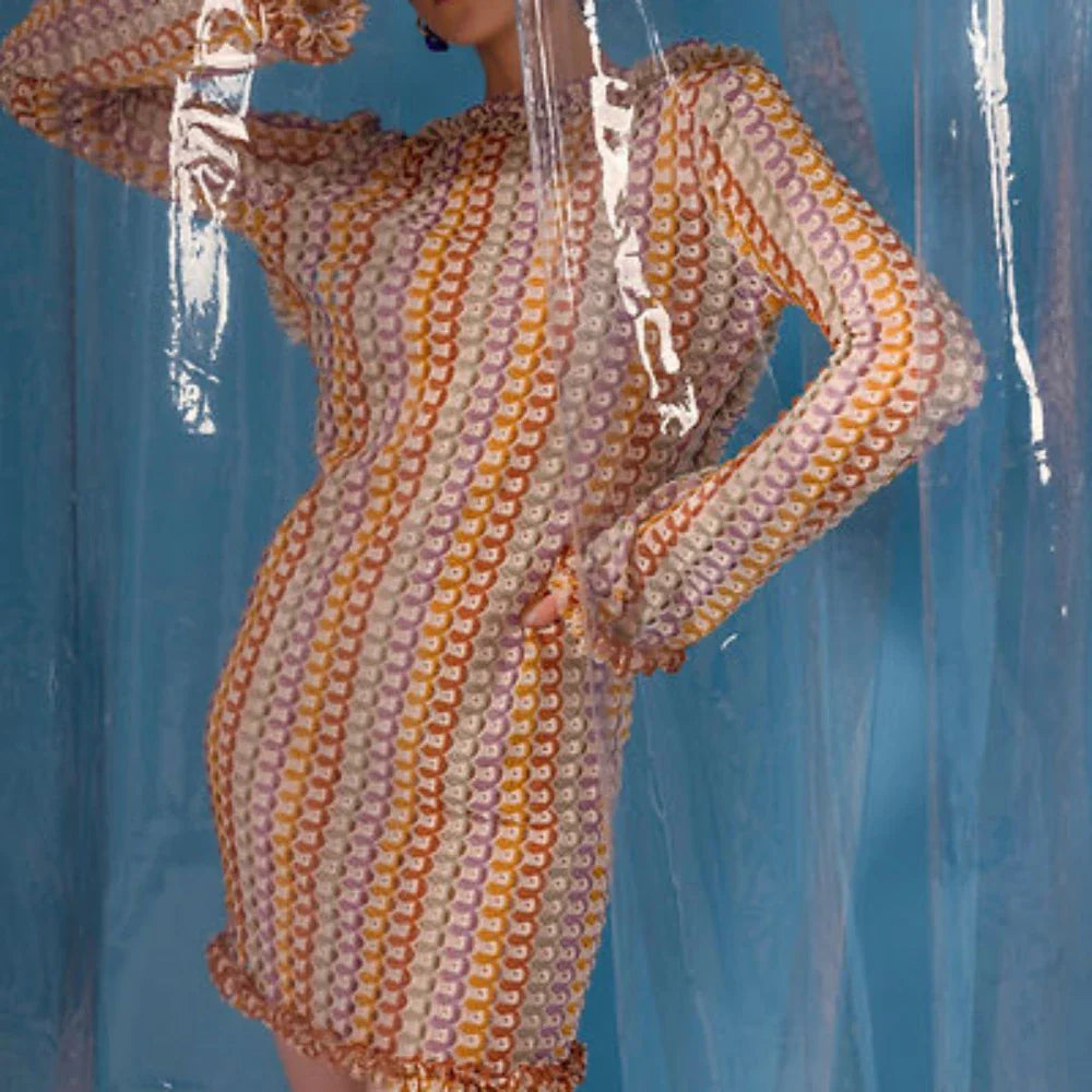 Vestido de praia de malha sem costas feminino, moda praia, mini vestido boho vazado, elegante, colorido, manga comprida, saída de praia