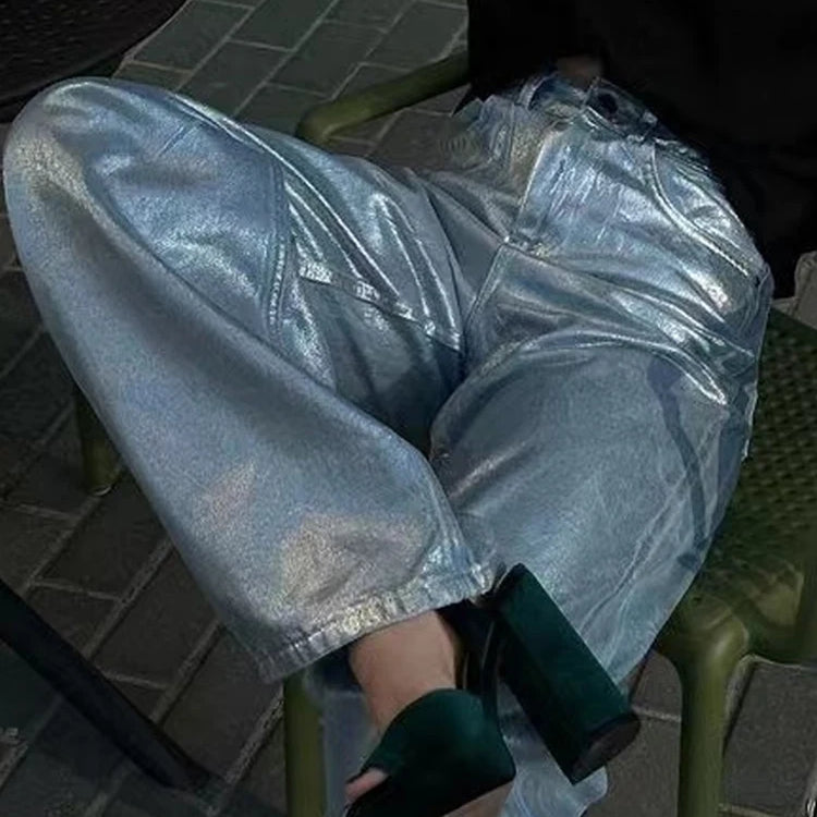 Americano prata cintura alta perna larga jeans para mulheres verão chique metálico brilhante reto baggy calças jeans all-match