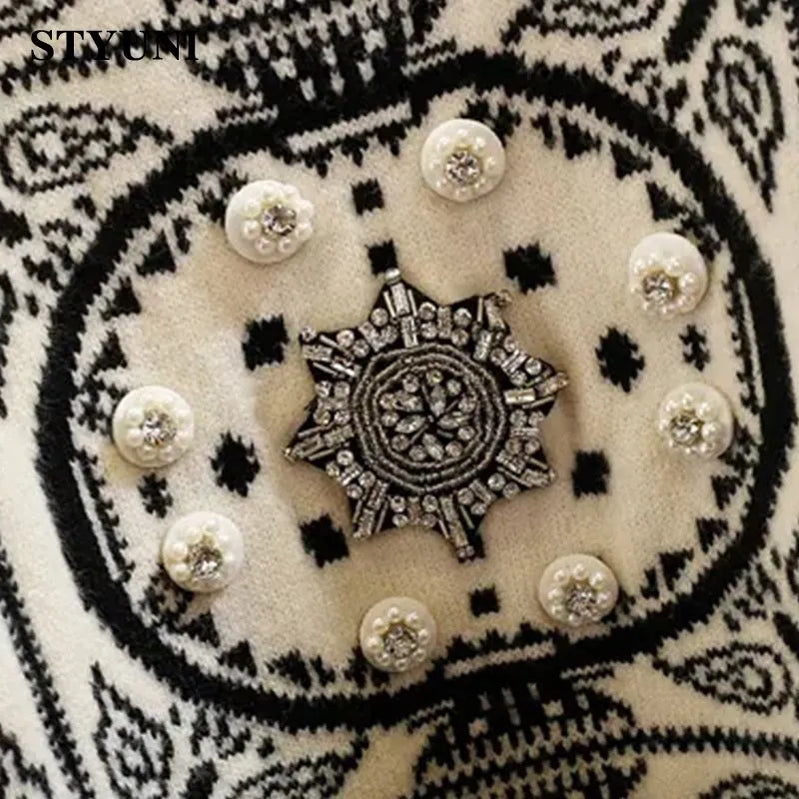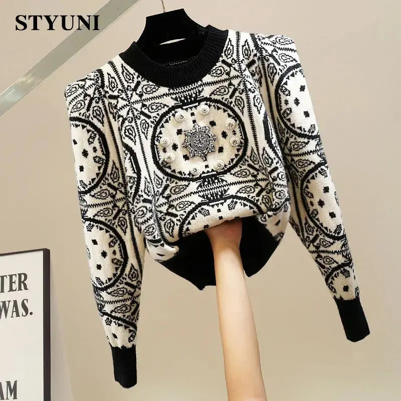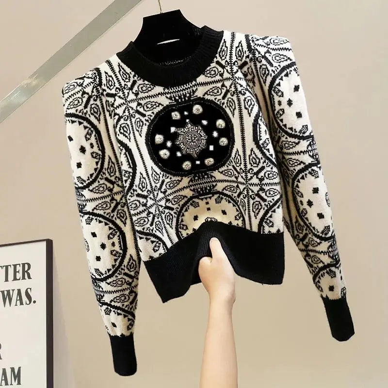 Preto acrílico malha diamantes miçangas o-pescoço manga longa camisola feminina moda coreana chique pulôver suéteres outono inverno