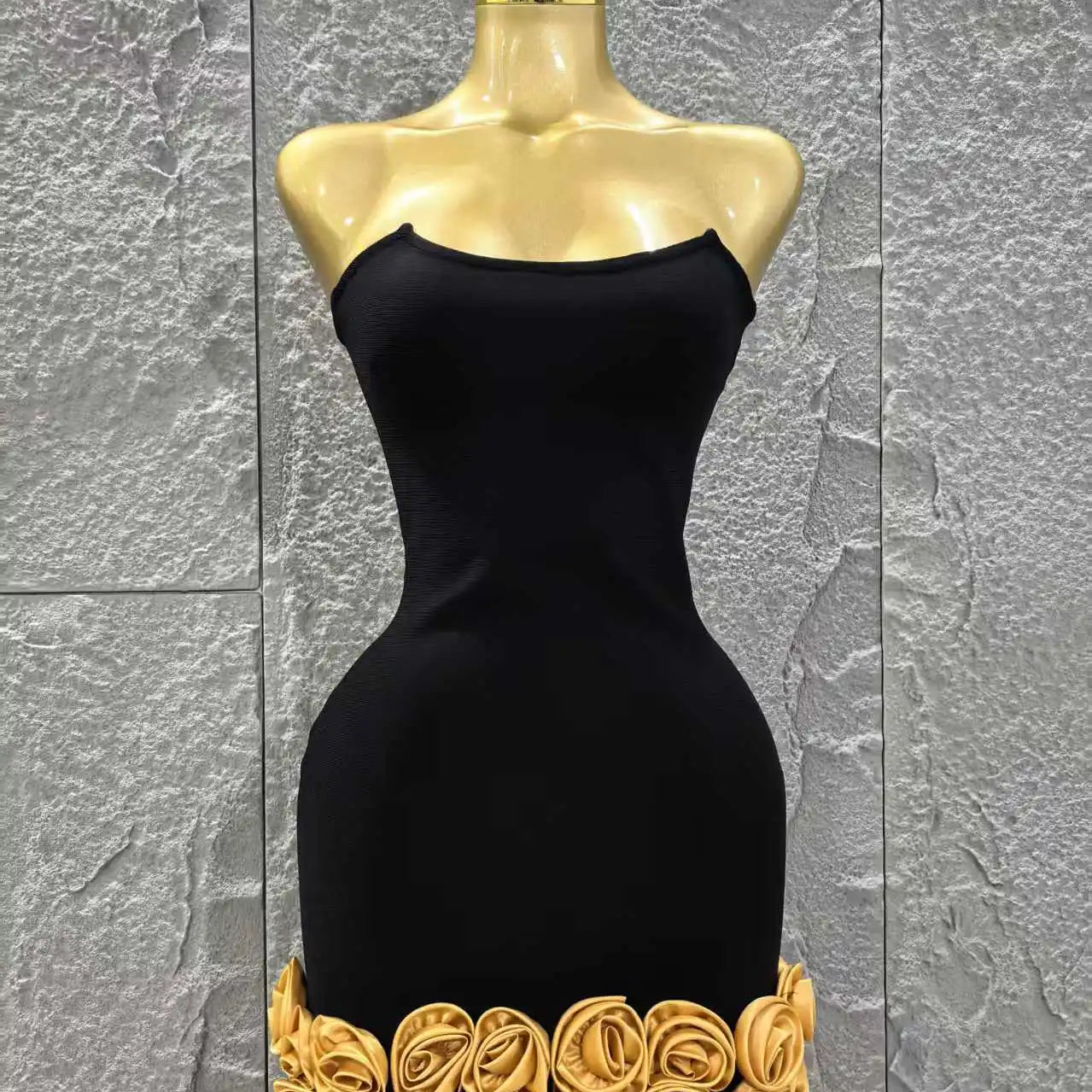 Vestido curto bandage preto dourado floral feminino, sexy, sem alças, justo, para festa de aniversário e férias