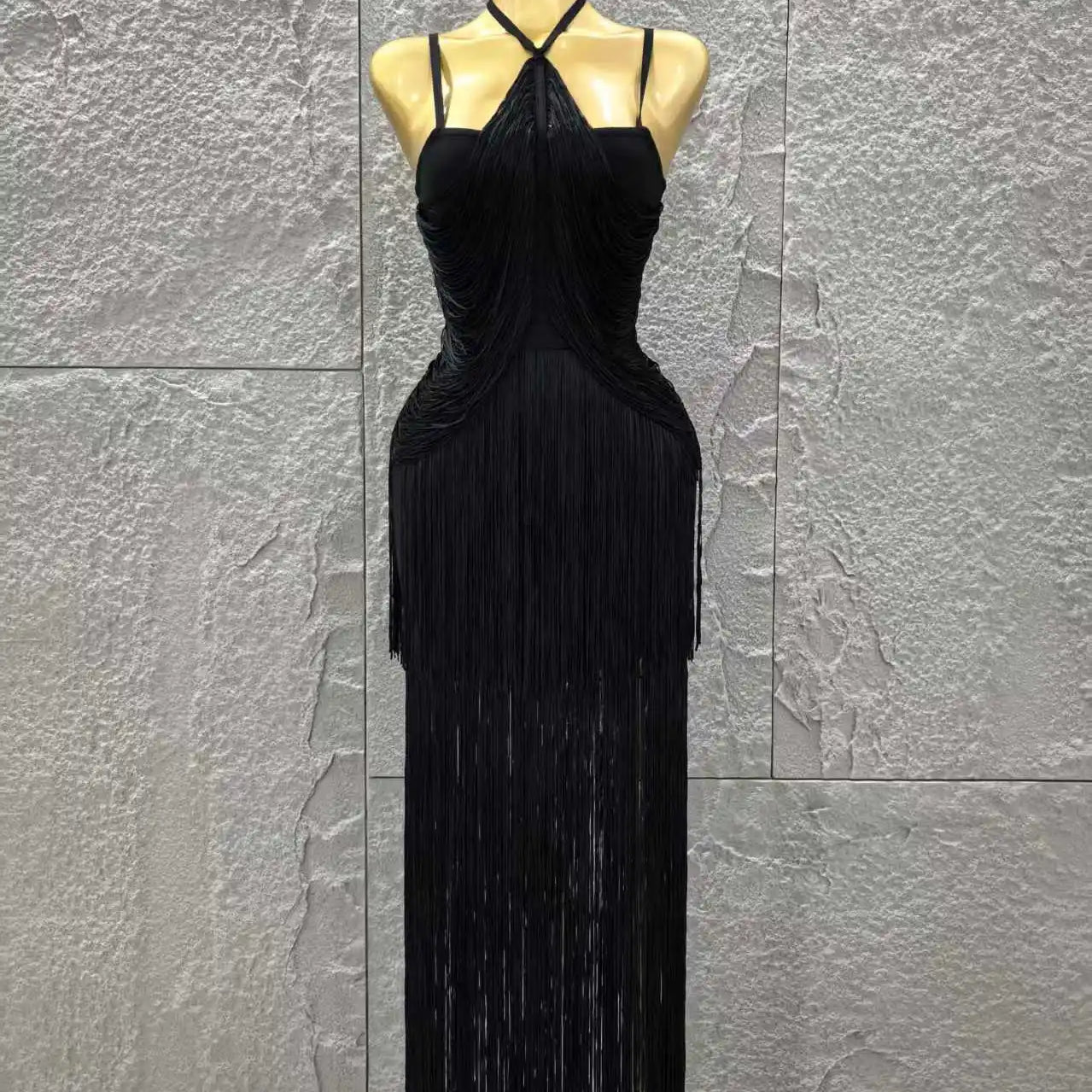 Vestido longo preto sem mangas feminino, sexy, com decote em V, com borlas, justo, bandagem, para festa noturna, coquetel