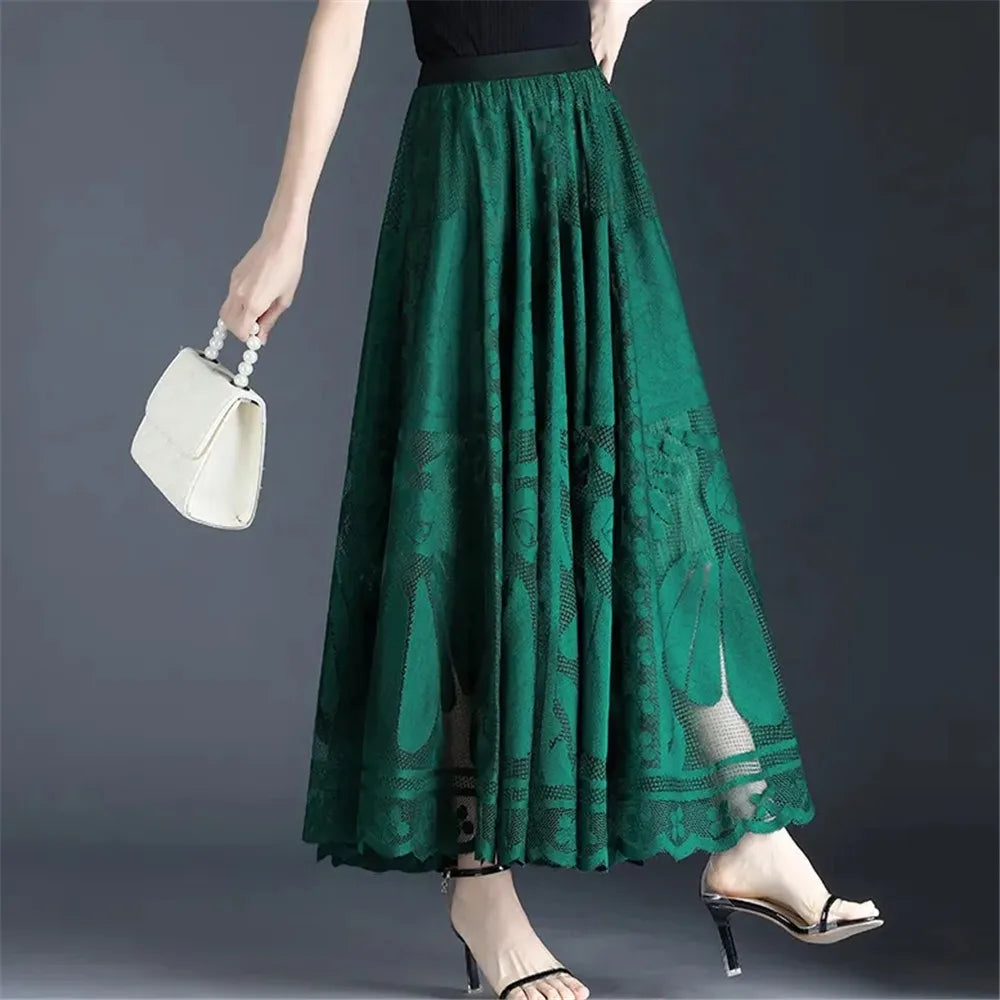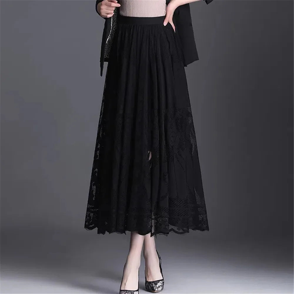 Saia de tule com babados e renda preta, saia longa feminina, outono inverno, linha A, saia plissada vazada de gaze, para escritório, para mulheres