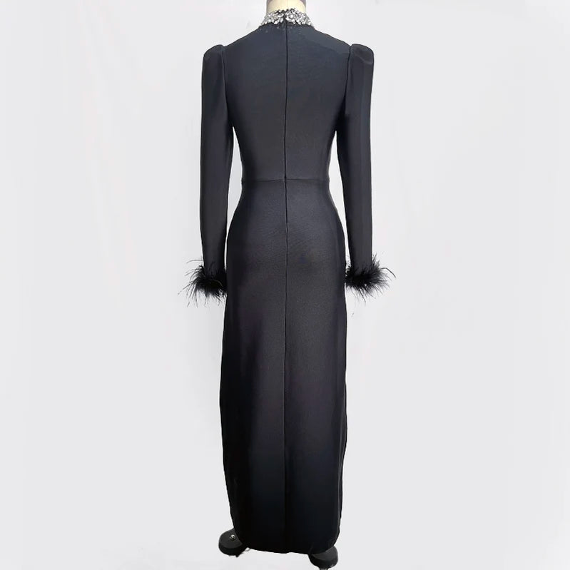 Vestido longo feminino, preto, vermelho, manga longa, sexy, brilhante, com cristais, colado, para festa à noite, baile