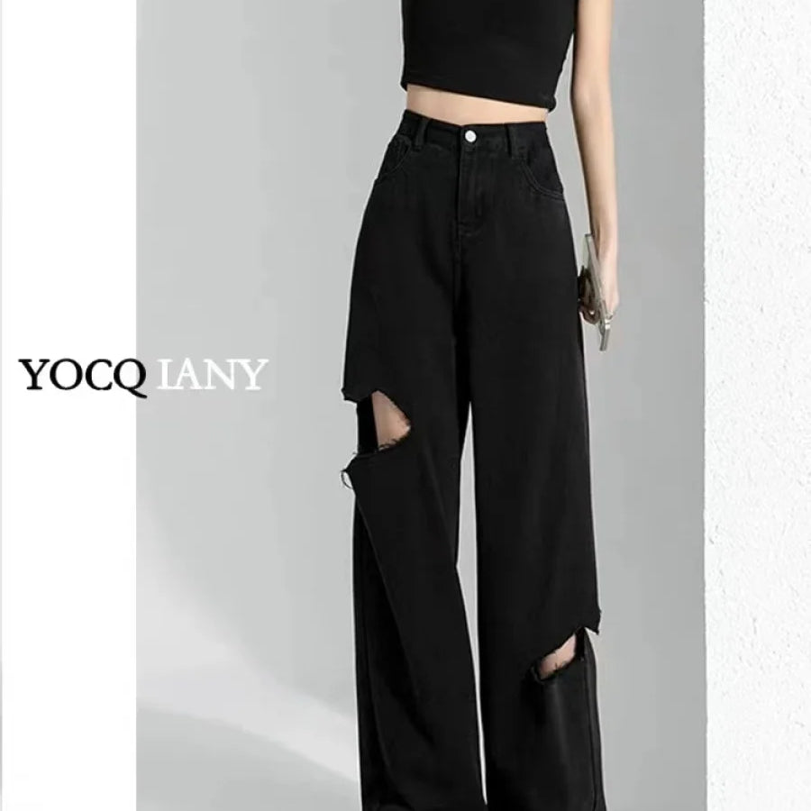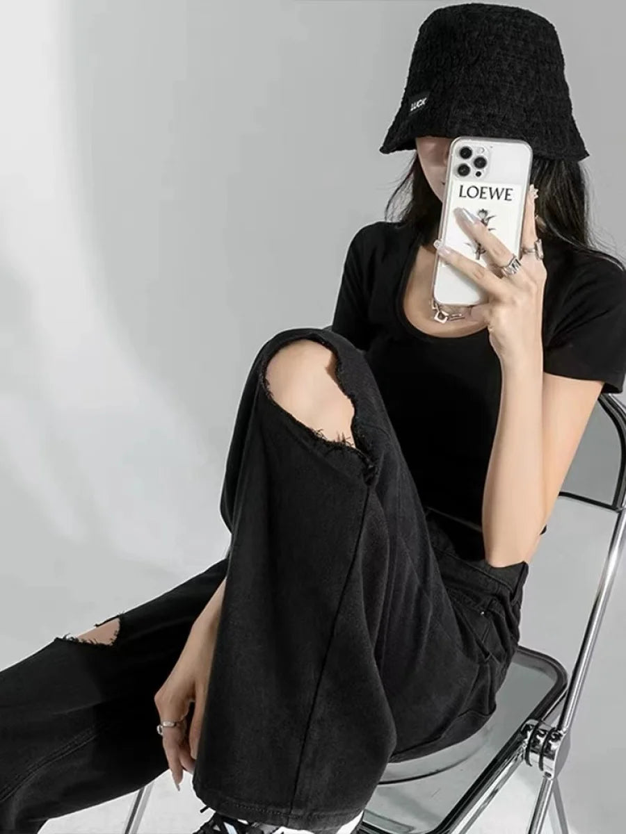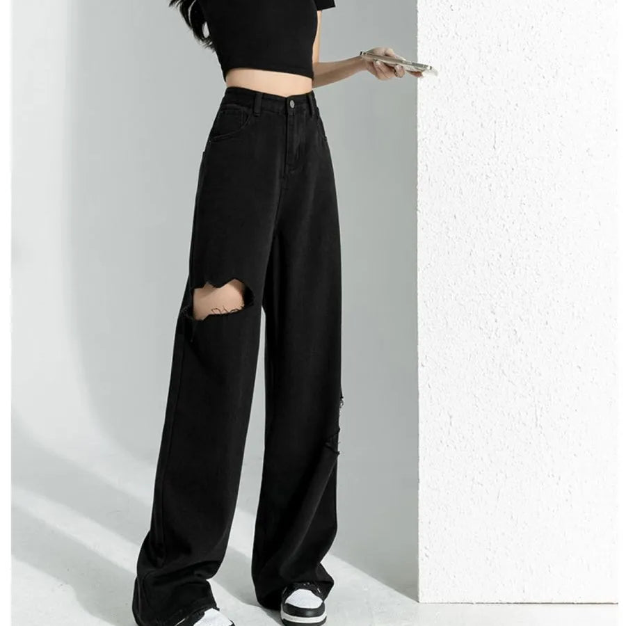 Calça jeans preta rasgada feminina, verão, reta, Y2K, moda coreana, feminina, cintura alta, larga, denim