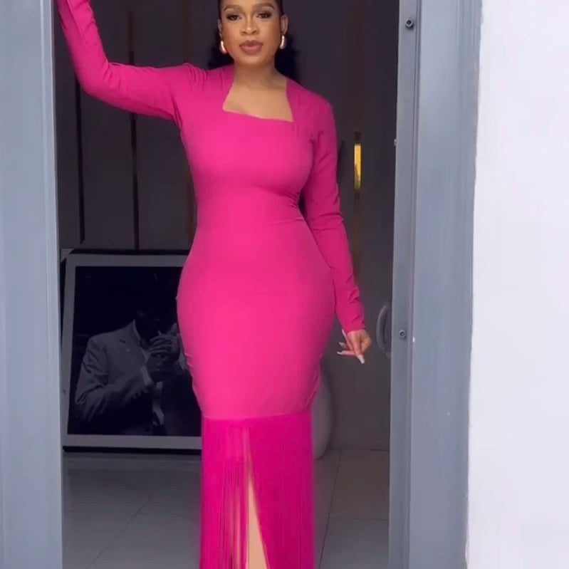 Vestido longo feminino preto rosa com manga comprida, gola quadrada, borlas, justo, bandagem, boate, festa, comemoração