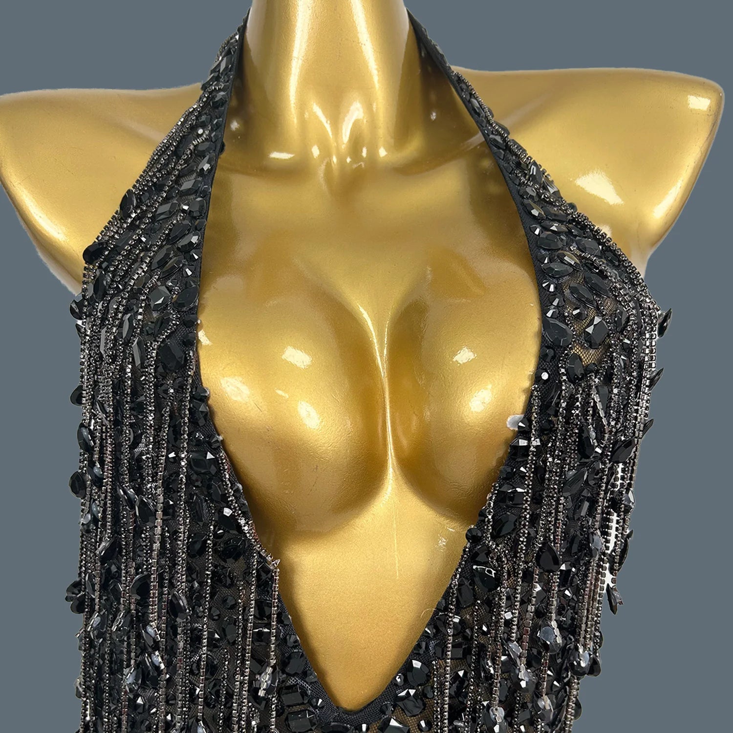 Black Tassel Sparkly Crystals Deep V Neck Evening Gown Low-cut Long Dress Birthday Celebrate Party Photo Shoot Wear Wulongweibo
