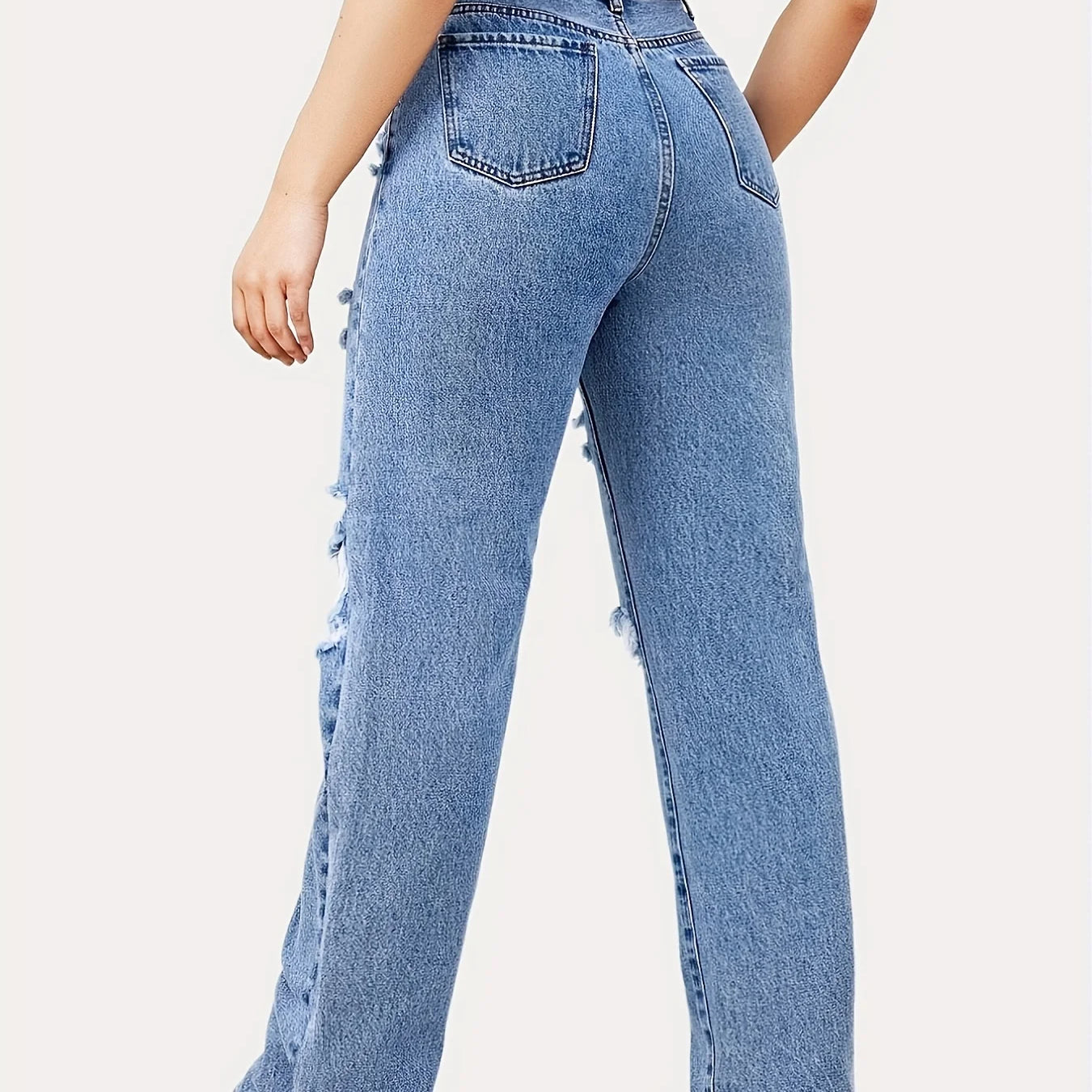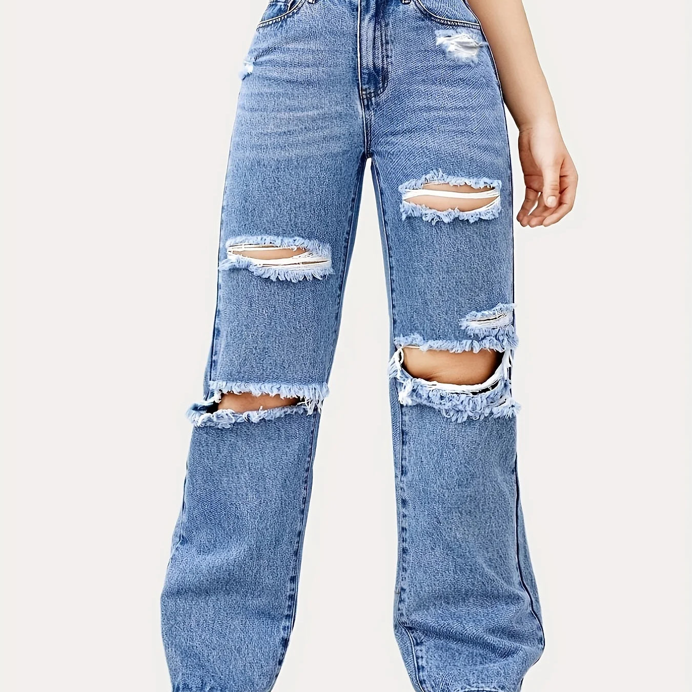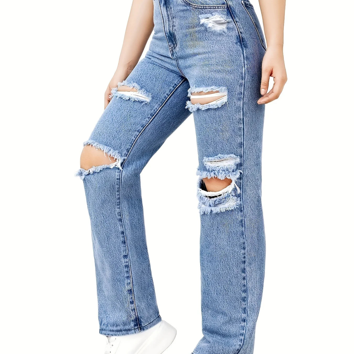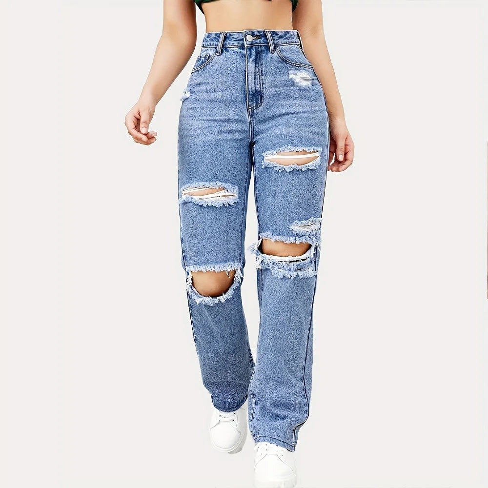 Calça jeans reta larga rasgada azul, bolsos faca, cintura alta desgastada, ajuste solto, jeans e roupas femininas