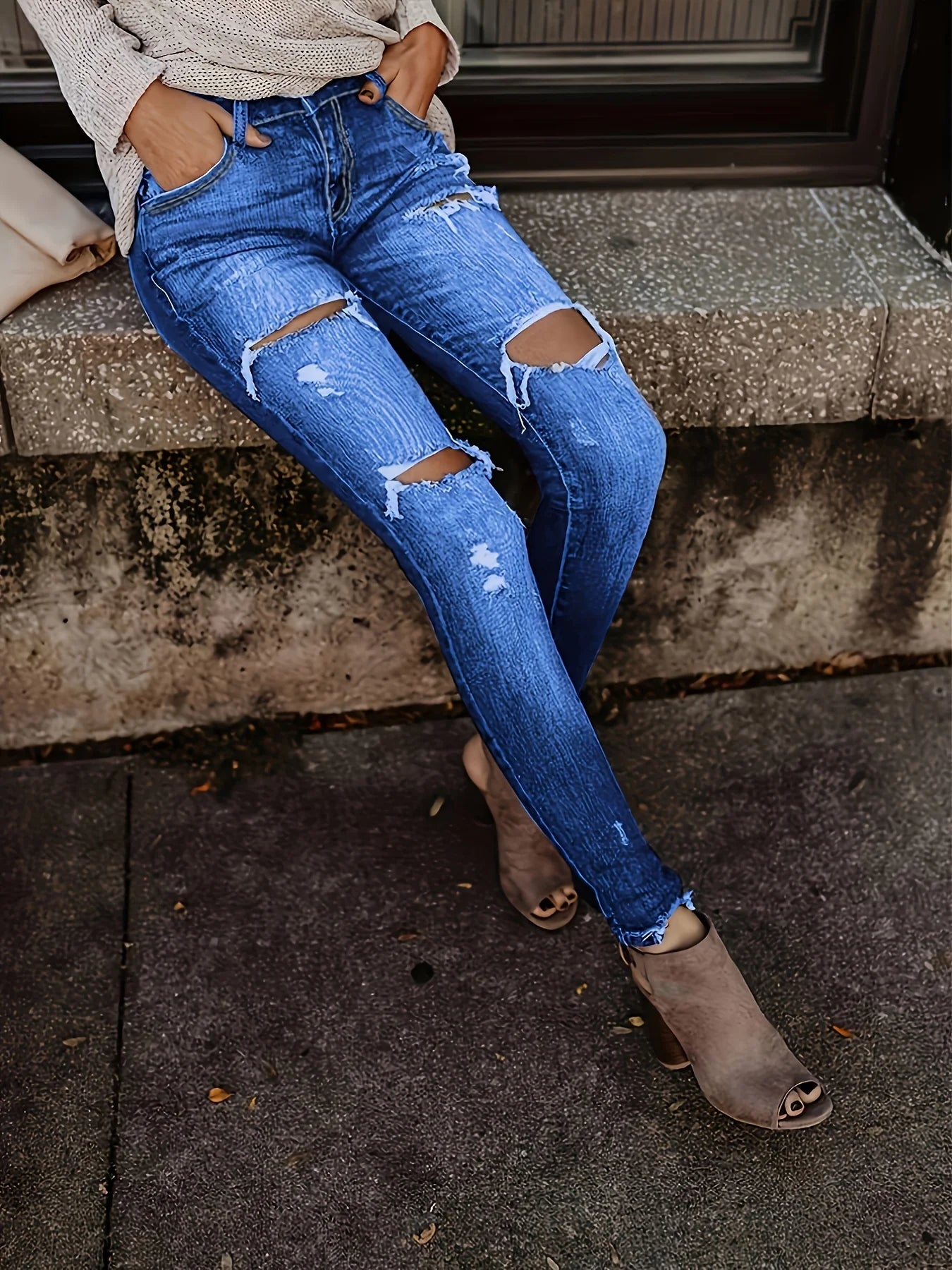 Calça jeans skinny azul rasgada, calça jeans slim fit desgastada, bolsos cortados, bainha crua, jeans feminino e roupas