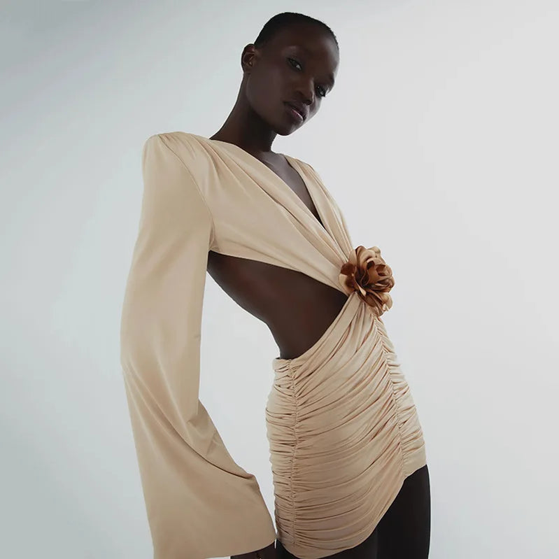 BoozRey Sexy Deep V Flor Mangas Compridas Sem Costas Vestido Verão Elegante com Ombreiras Mini Vestido Festa Clube Roupas Feminino