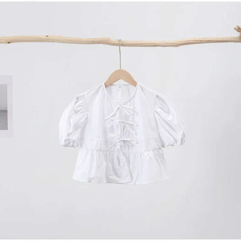 Camisa feminina com amarração borboleta, pregas, manga bufante, chique, slim, lisa, verão, doce, feminina, gola V