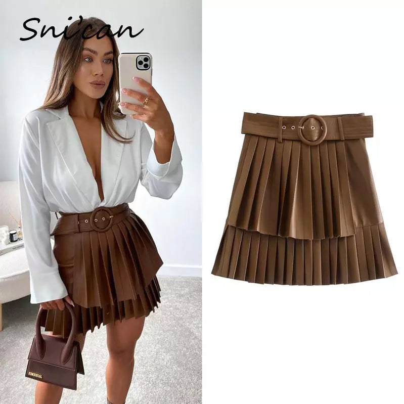 Bown saia de couro pu com cinto moda outono sprint em cascata plissado cintura alta jupe cuir femme feminino falda plisada
