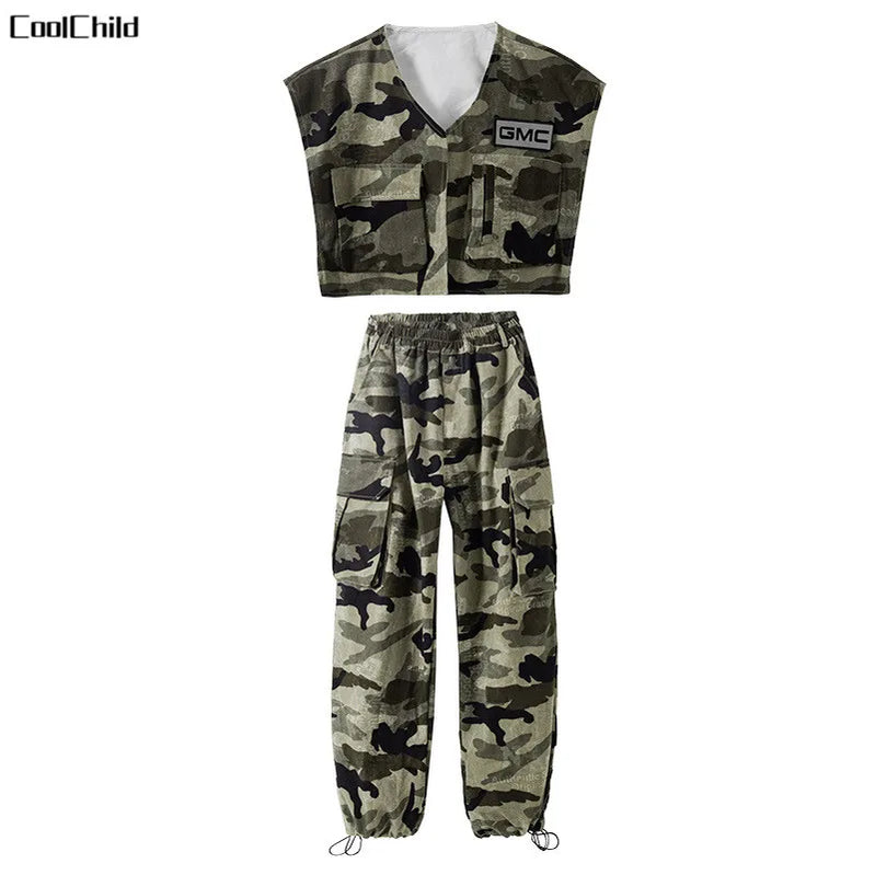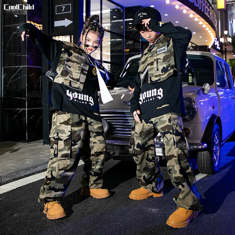 Meninos streetwear meninas hip hop camuflagem colete calças de carga crianças militar jogger dança rua crianças traje adolescente moda outfit
