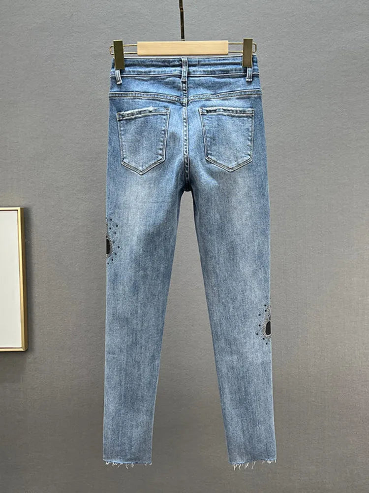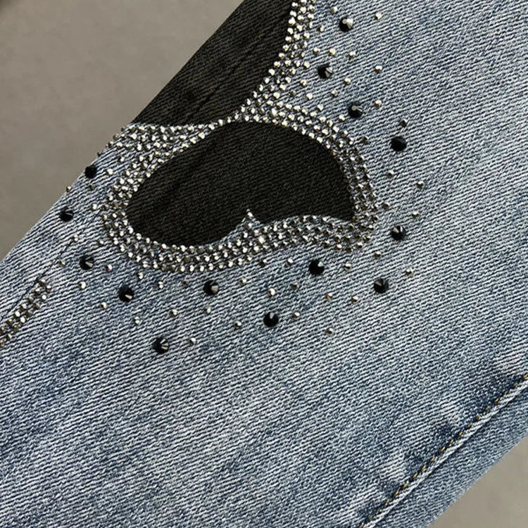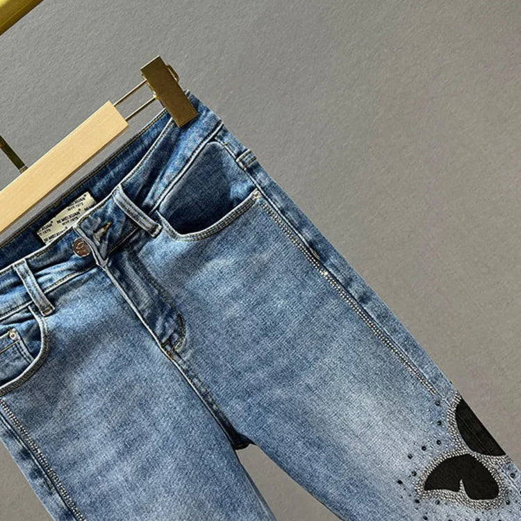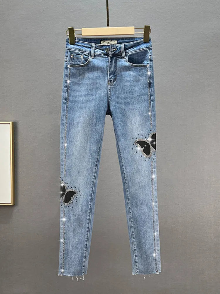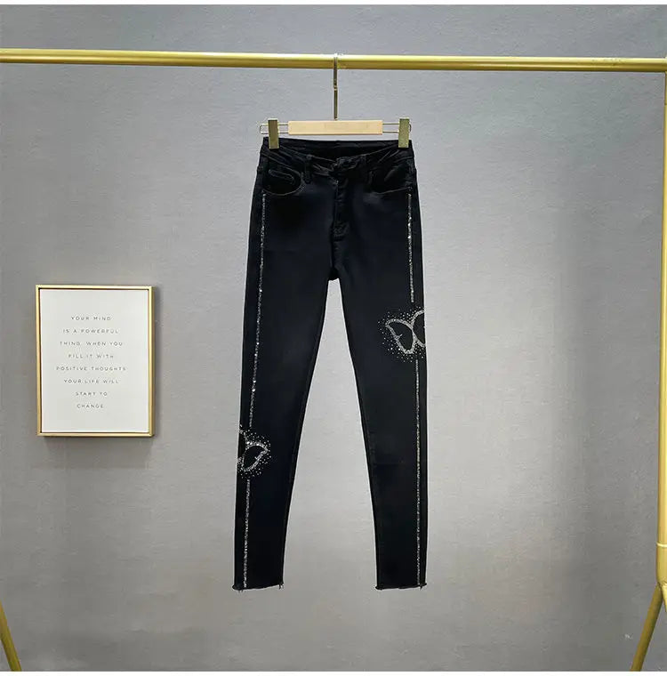 Borboleta lantejoulas jeans feminino bling bling primavera outono mulher cintura alta lápis calças jeans