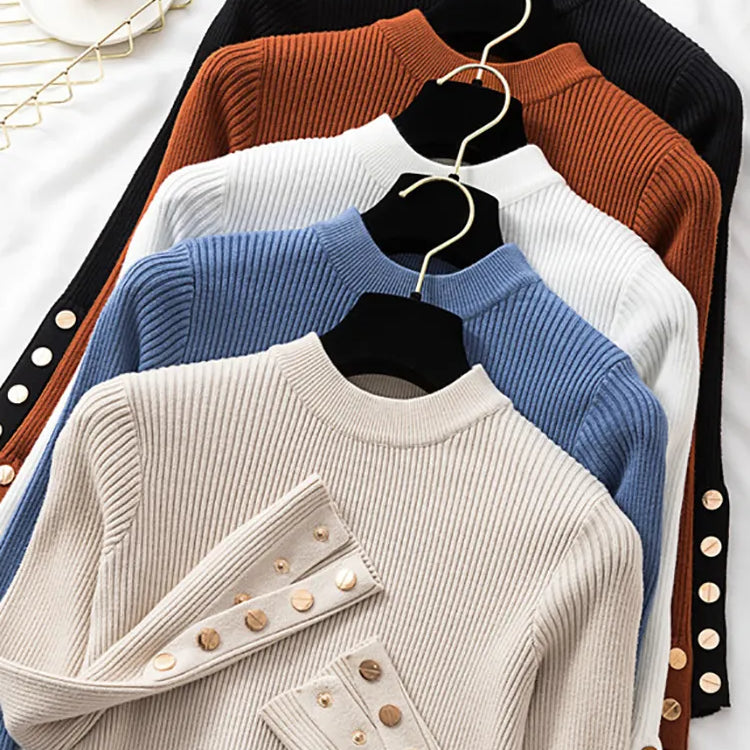 Suéter casual feminino de outono e inverno, suéter grosso com botões, manga comprida, gola redonda, suéter chique feminino, suéter fino de malha macia