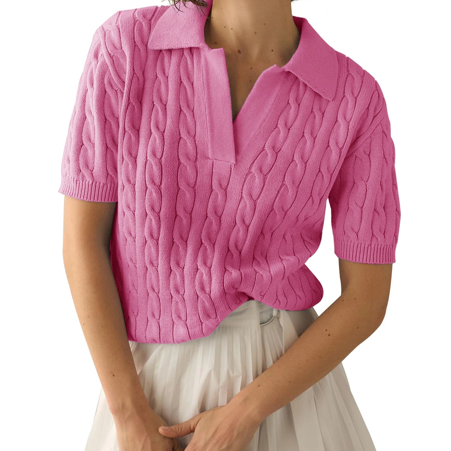 Suéter casual rosa choque de malha solta com decote em V e manga curta, pulôver, moda primavera-verão, gola de lapela macia, top de malha Y2K
