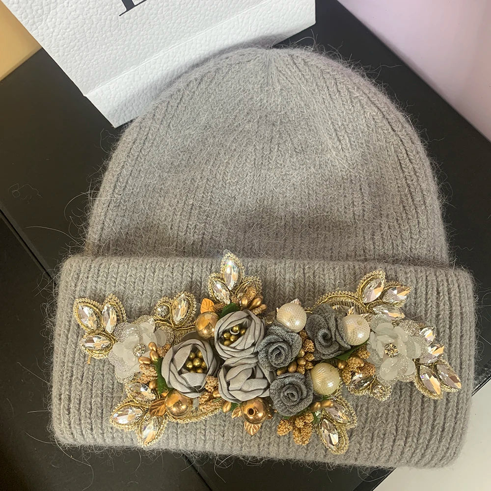 Gorro de inverno feminino de luxo, gorro de malha com pele de coelho de cristal para mulheres, casual, proteção auricular quente para esqui, boné de malha