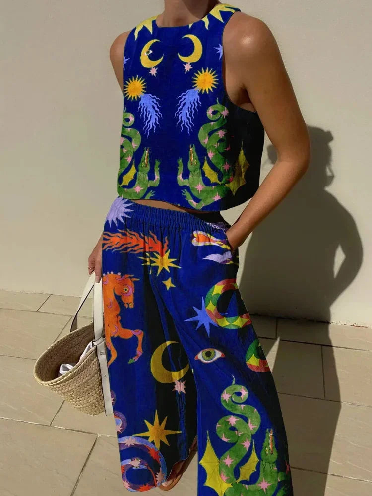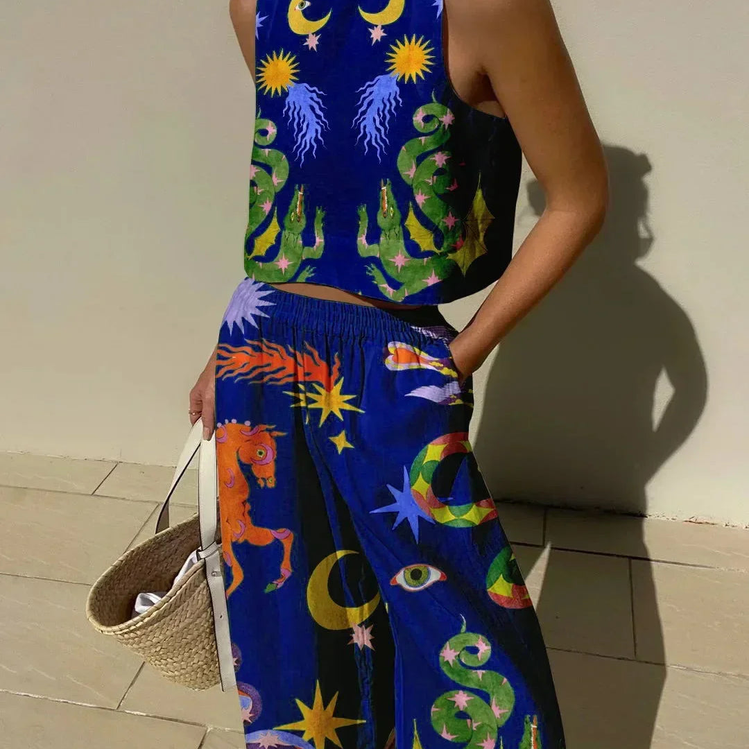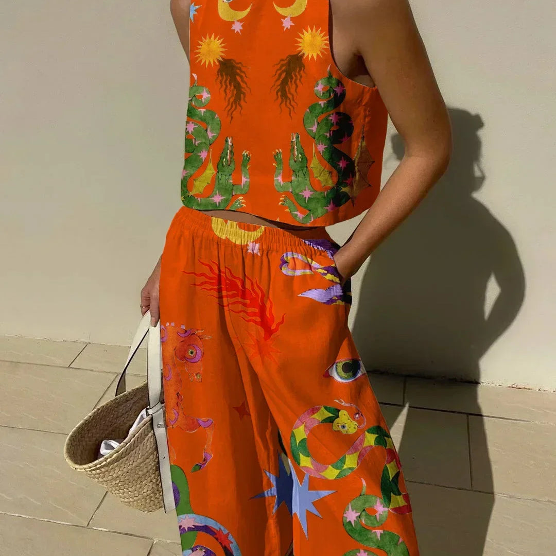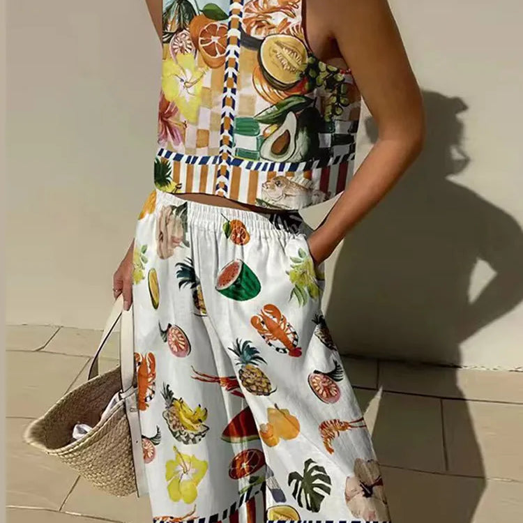 Conjunto de calça estampada casual feminina, vintage, gola redonda, sem mangas, colete, cintura alta, calças soltas, trajes femininos de praia e férias