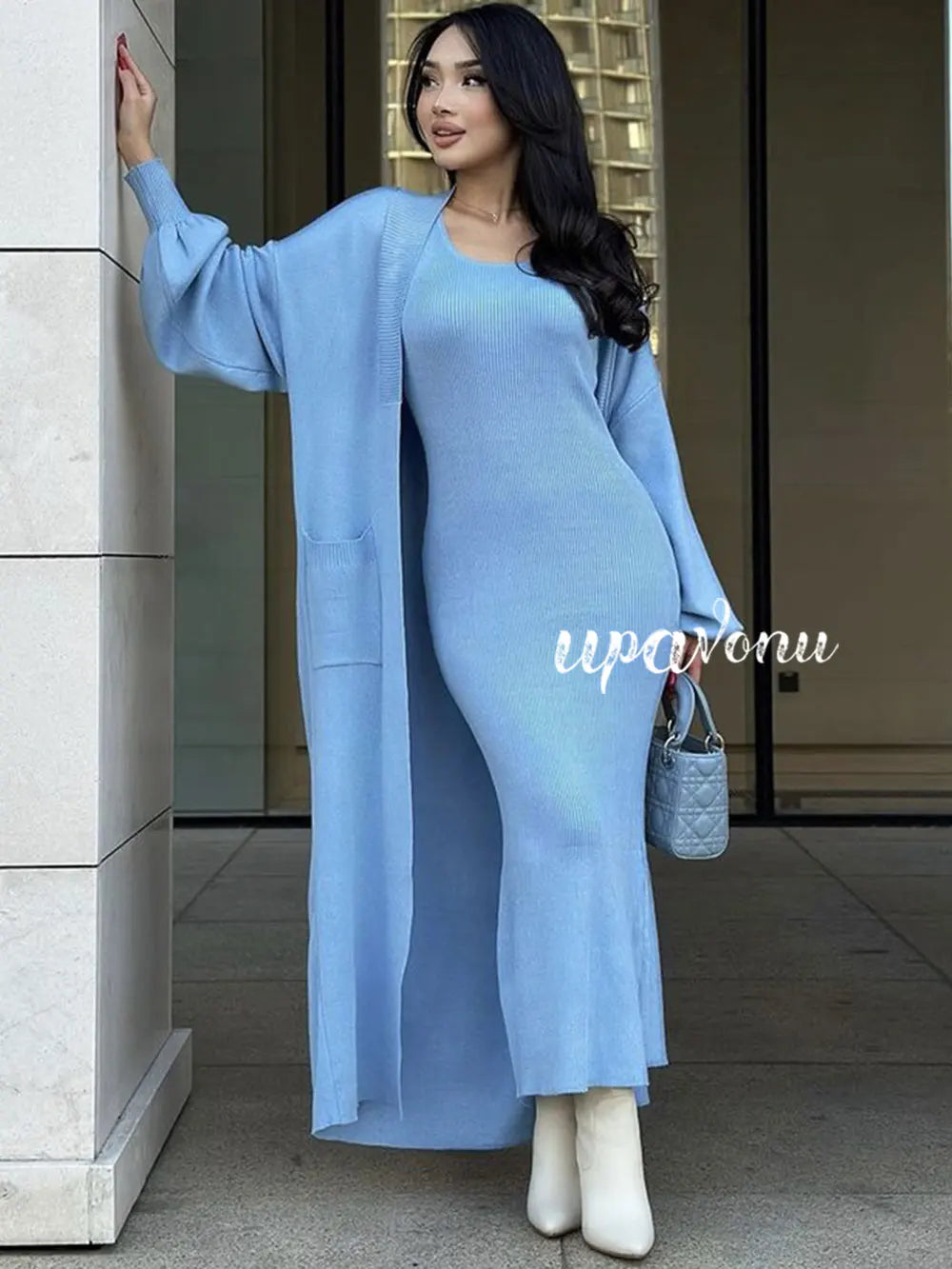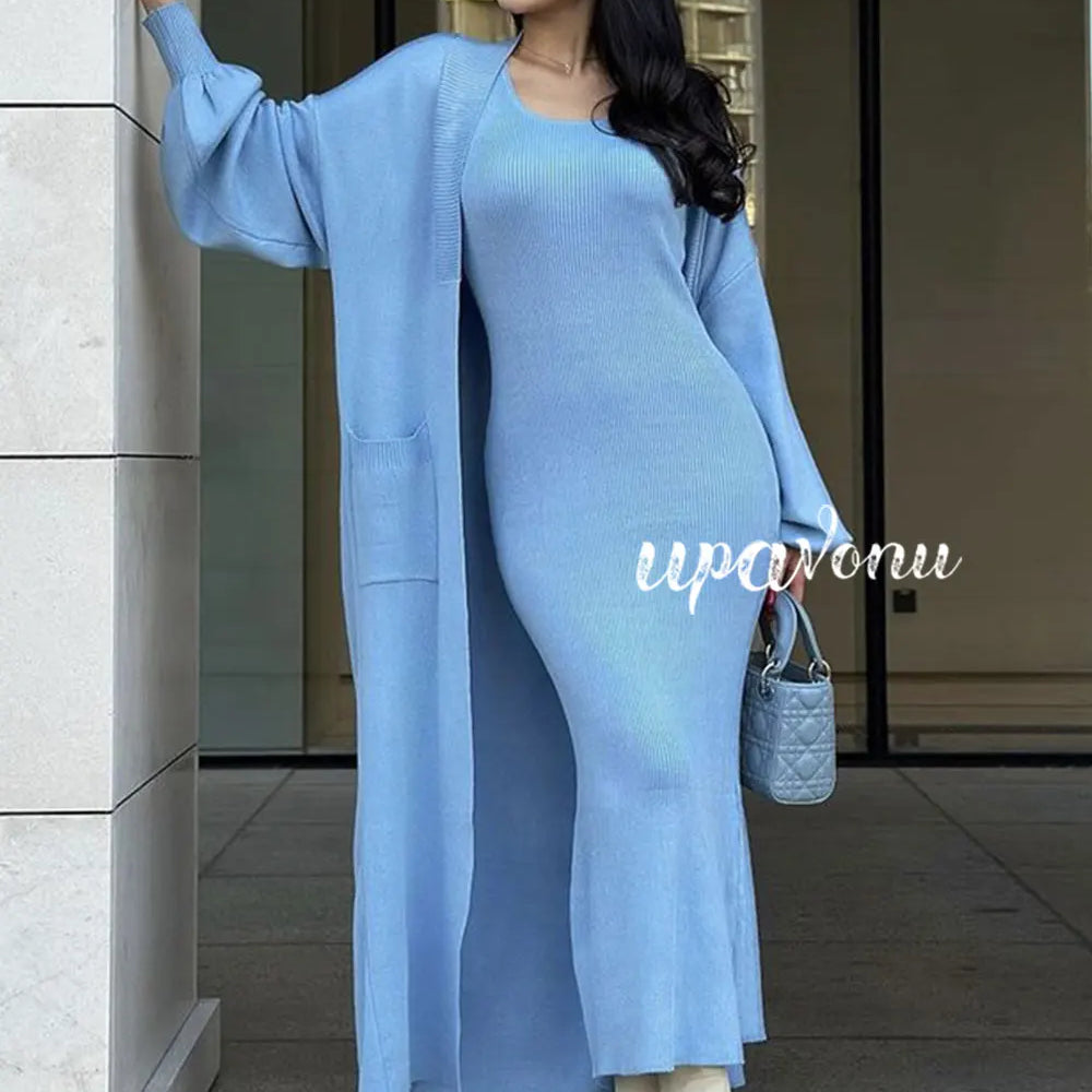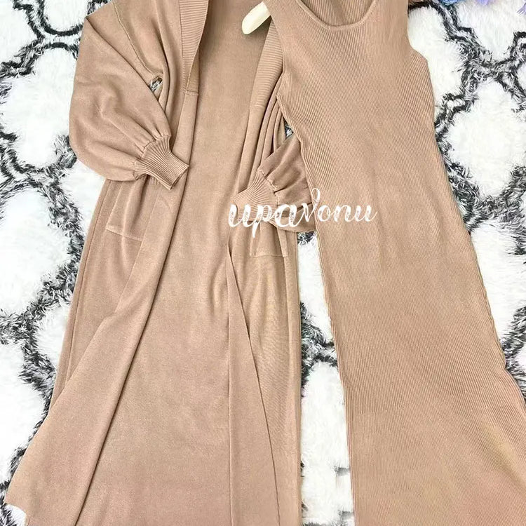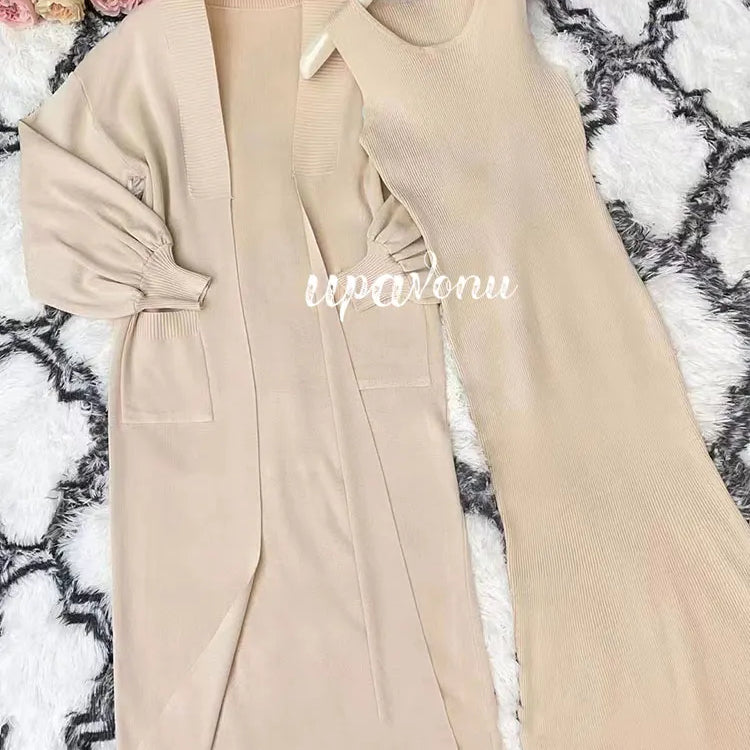 Casual Solid Knitted Sweater Long Dress Set Women Long Sleeve Loose Long Cardigan Coat&Sleeveless Mid length Dress Two Piece Set