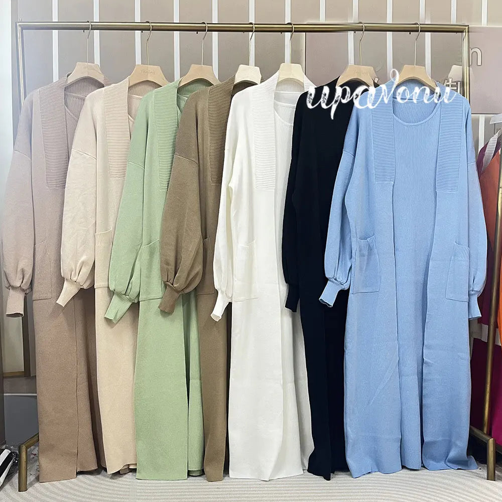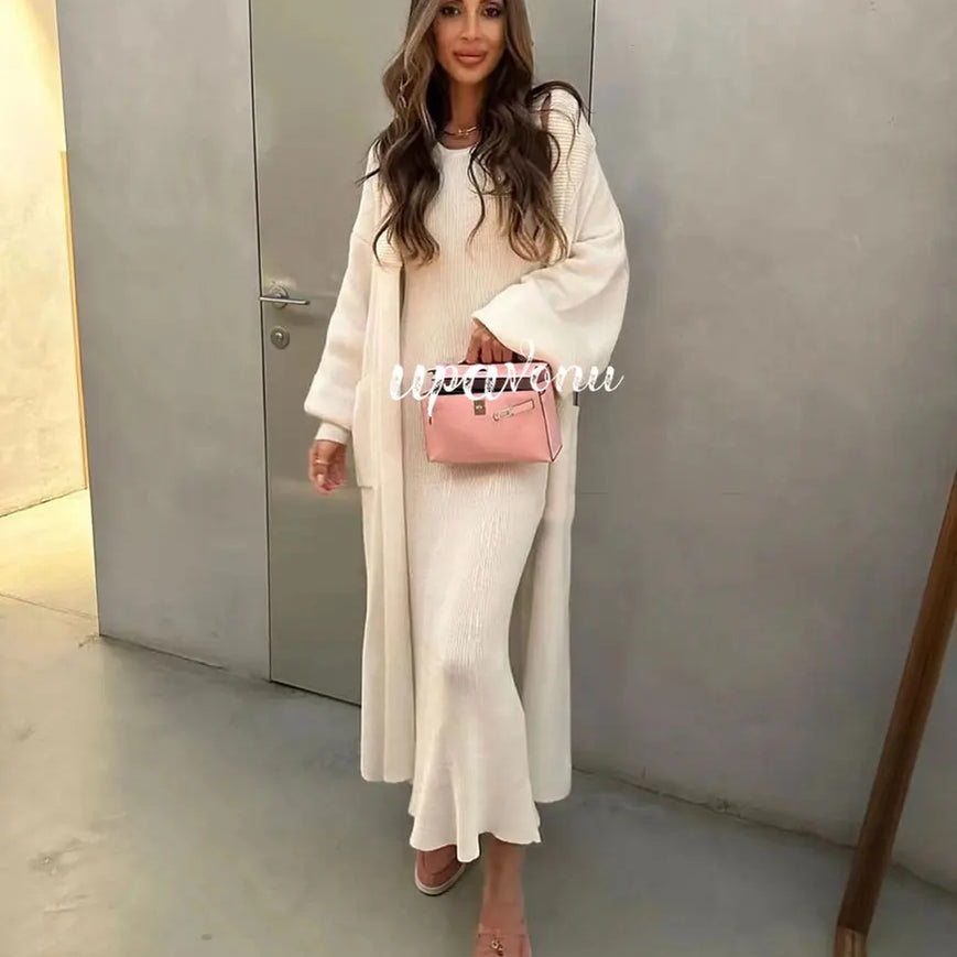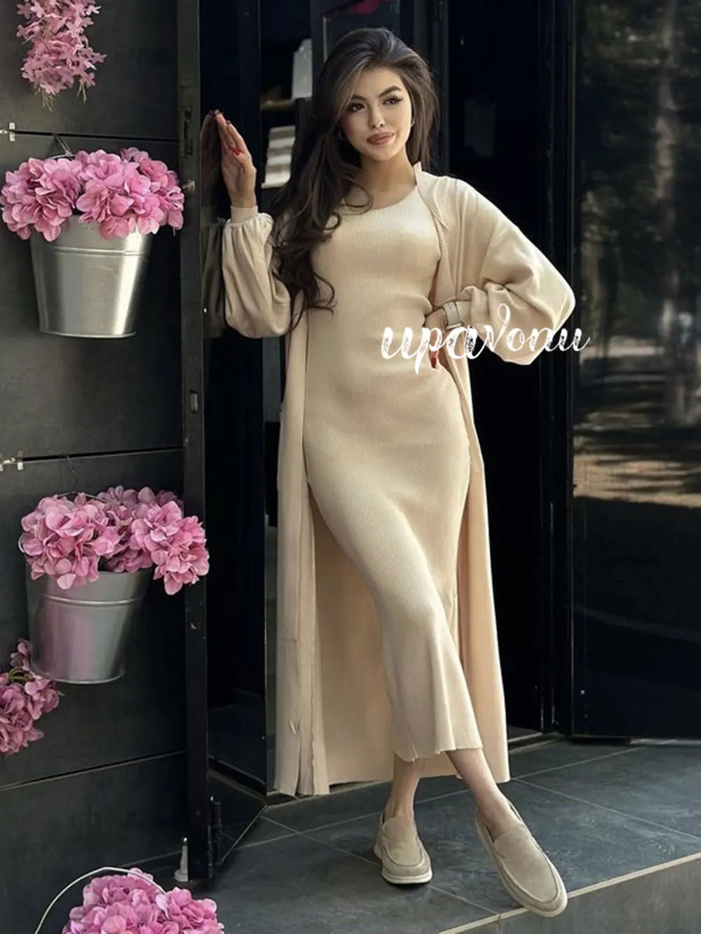 Casual Solid Knitted Sweater Long Dress Set Women Long Sleeve Loose Long Cardigan Coat&Sleeveless Mid length Dress Two Piece Set