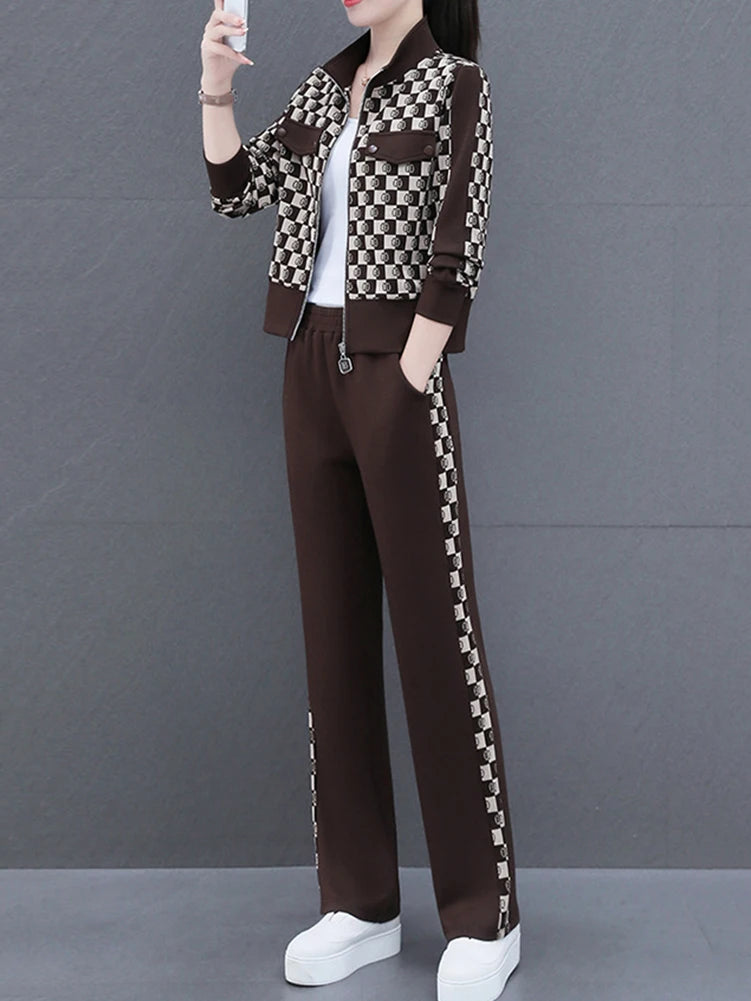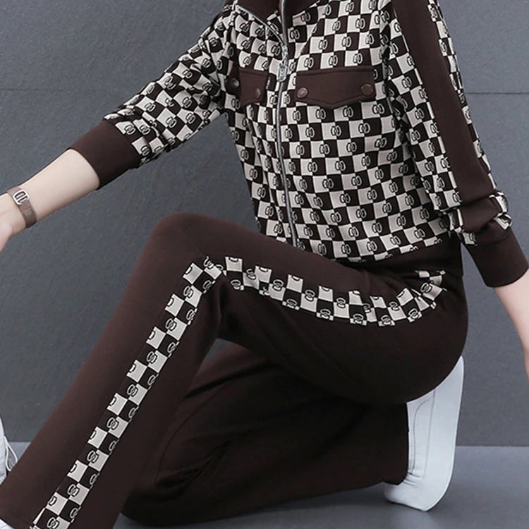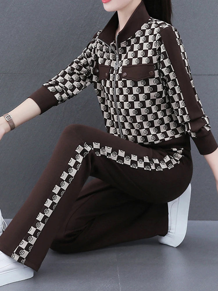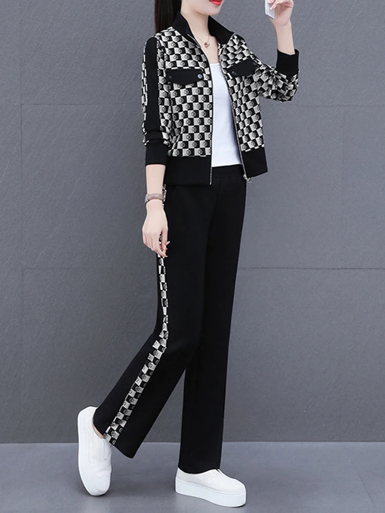 Moletom casual feminino moda outono com zíper casaco e calças cortadas conjunto de duas peças xadrez gola roupas