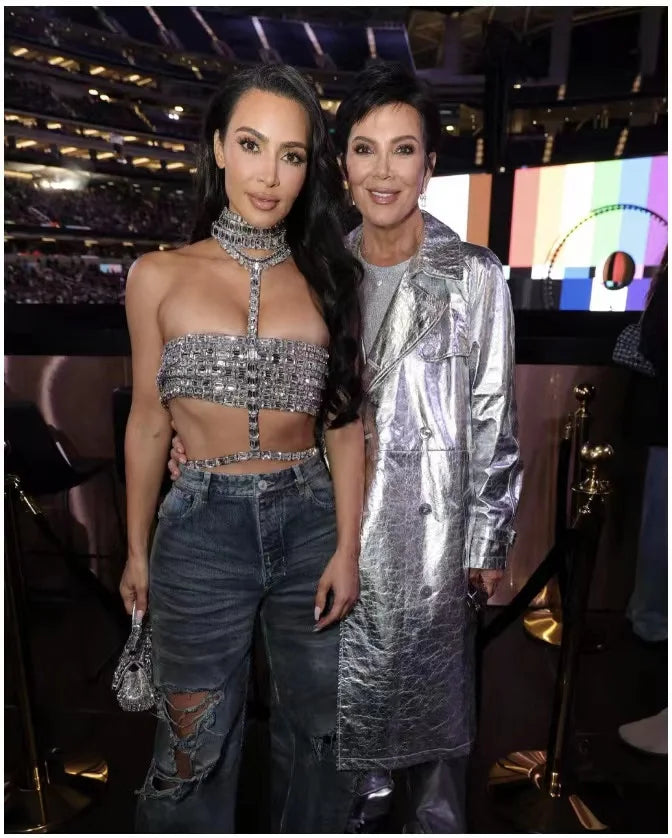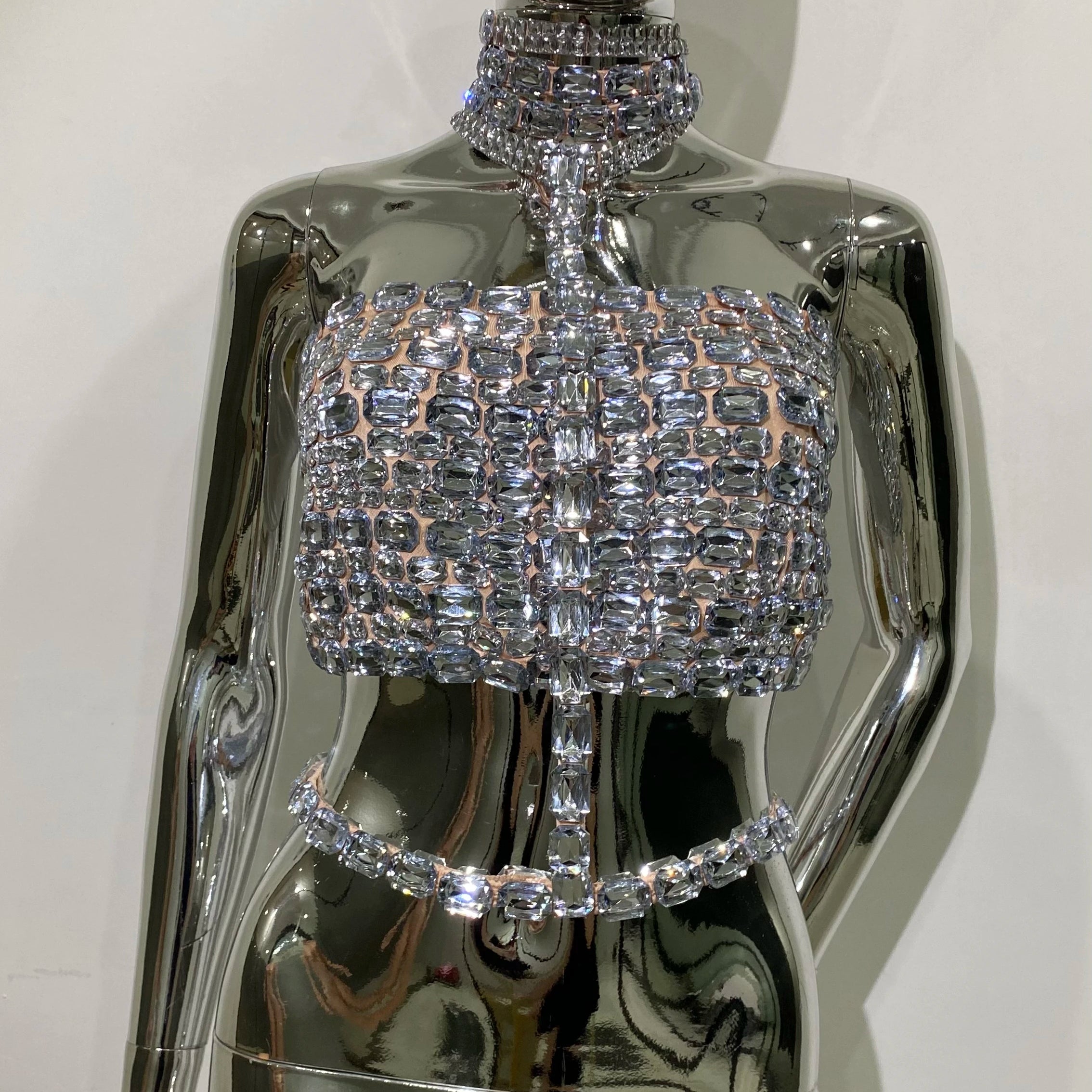 Moda de celebridades, tapete vermelho, roupas femininas brilhantes, grandes cristais, tops sensuais, halter, boate, festa, programa de TV, tops regata
