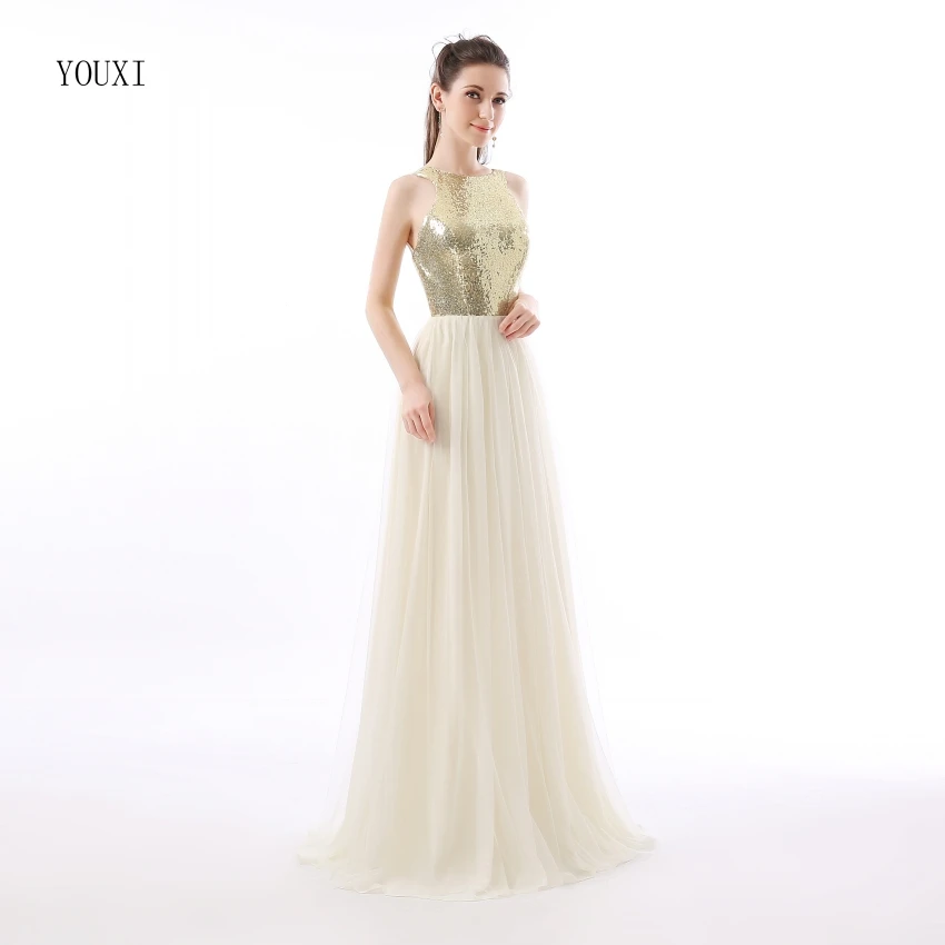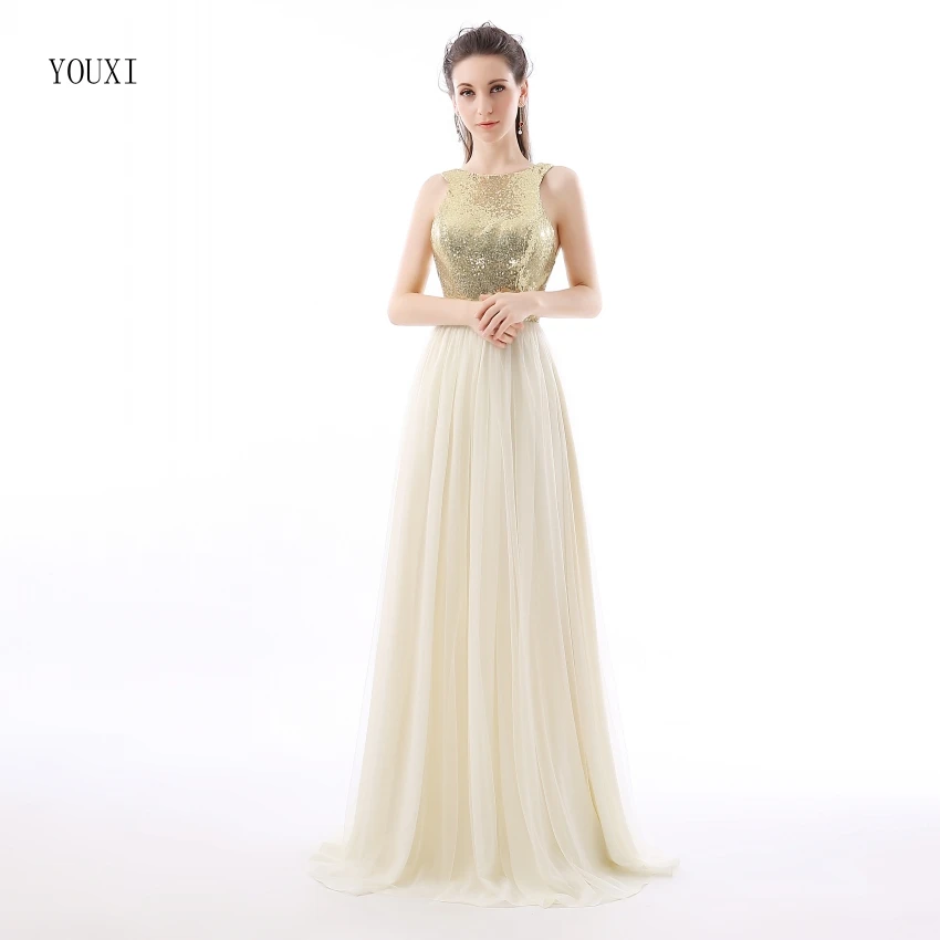 Vestidos de dama de honra charmosos em tule chiffon com top champanhe e lantejoulas douradas, vestido formal para baile, vestidos longos para ocasiões especiais