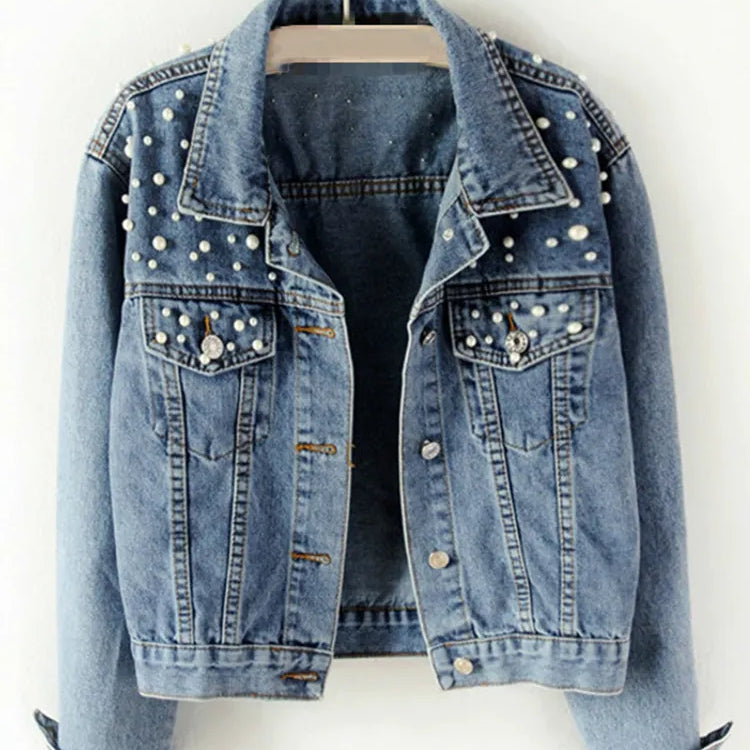 Outono moda feminina jaqueta jeans manga cheia botão solto pérolas lapela curta selvagem casual