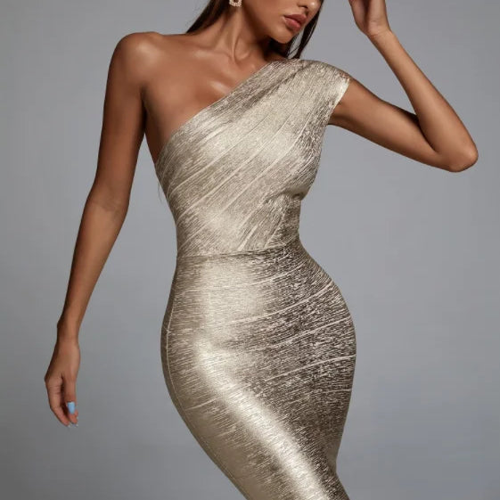 Vestido de celebridade com um ombro só, estampa dourada, rayon, bandagem, elegante, festa de clube