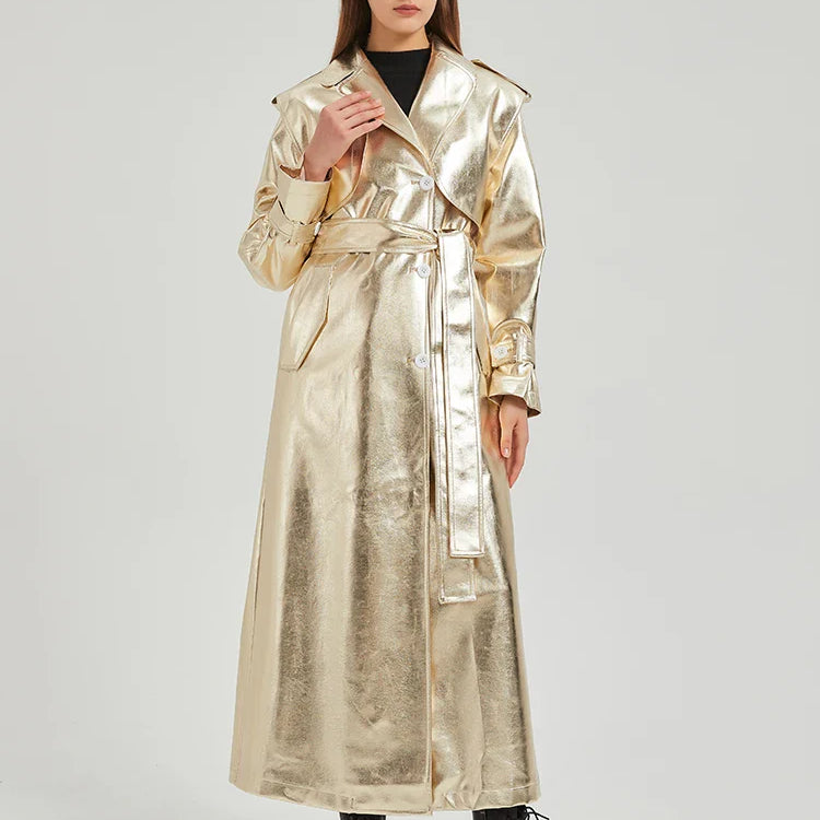 Casaco longo de couro sintético brilhante dourado para outono, sobretudo feminino de grife de luxo com abotoamento único