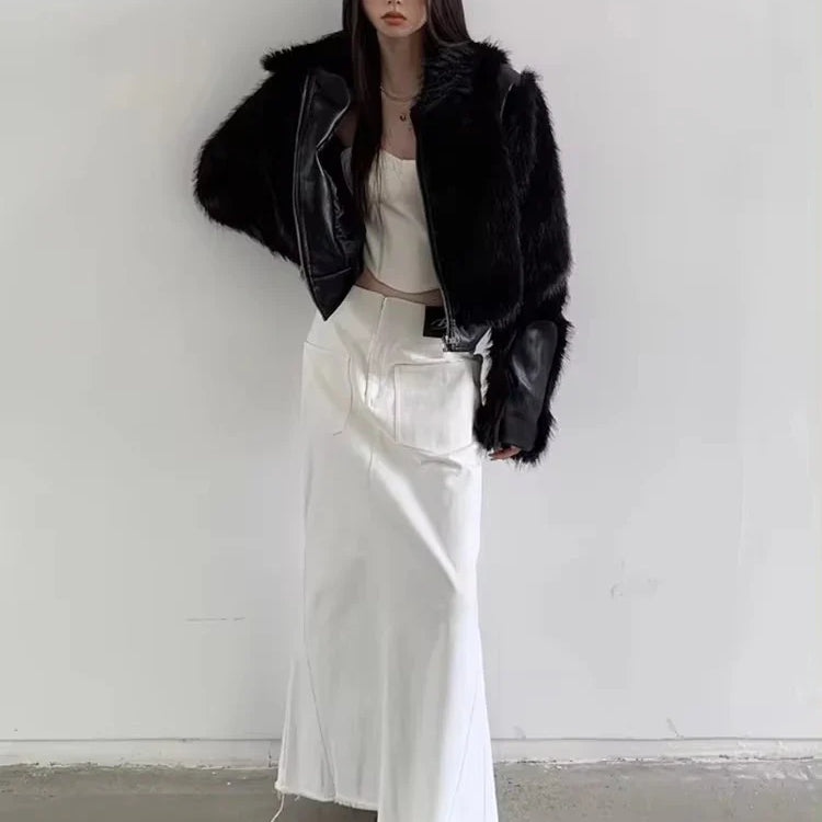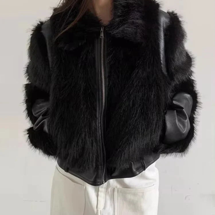 Casaco de pele de raposa sintética feminino, jaqueta curta, preta, macia, espessa, quente, peluda, felpuda, patchwork, outono inverno