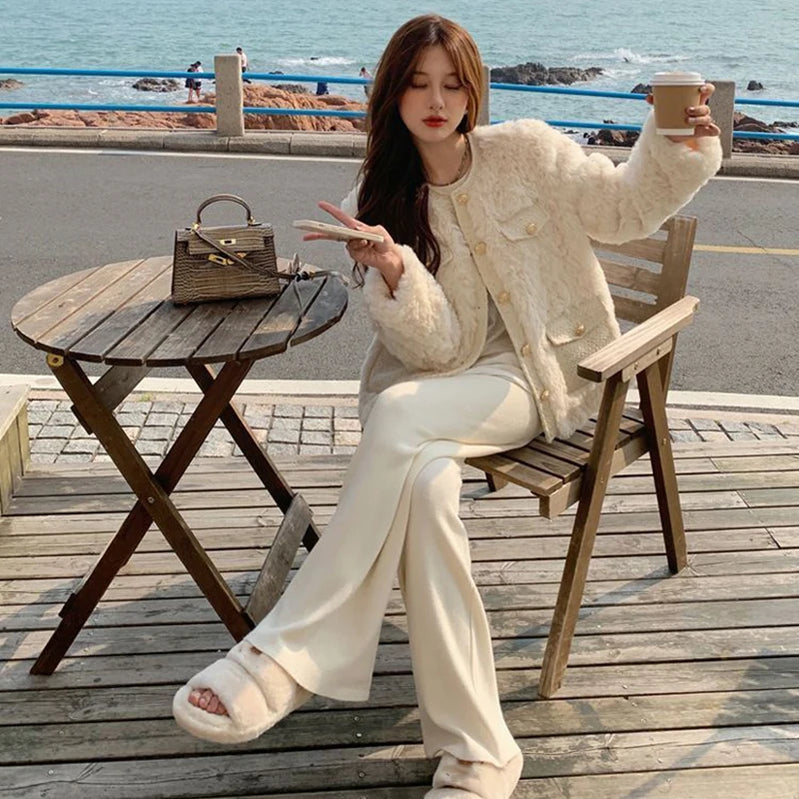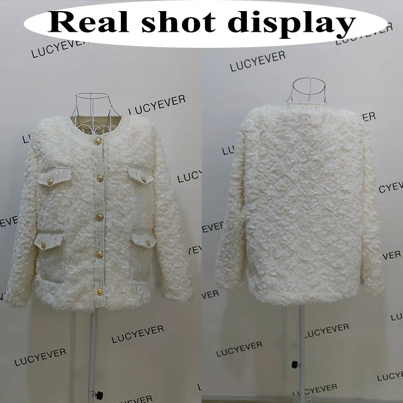 Outono inverno feminino jaqueta de lã de cordeiro estilo coreano streetwear o pescoço casaco de pele do falso mulher quente grosso peludo casaco fofo