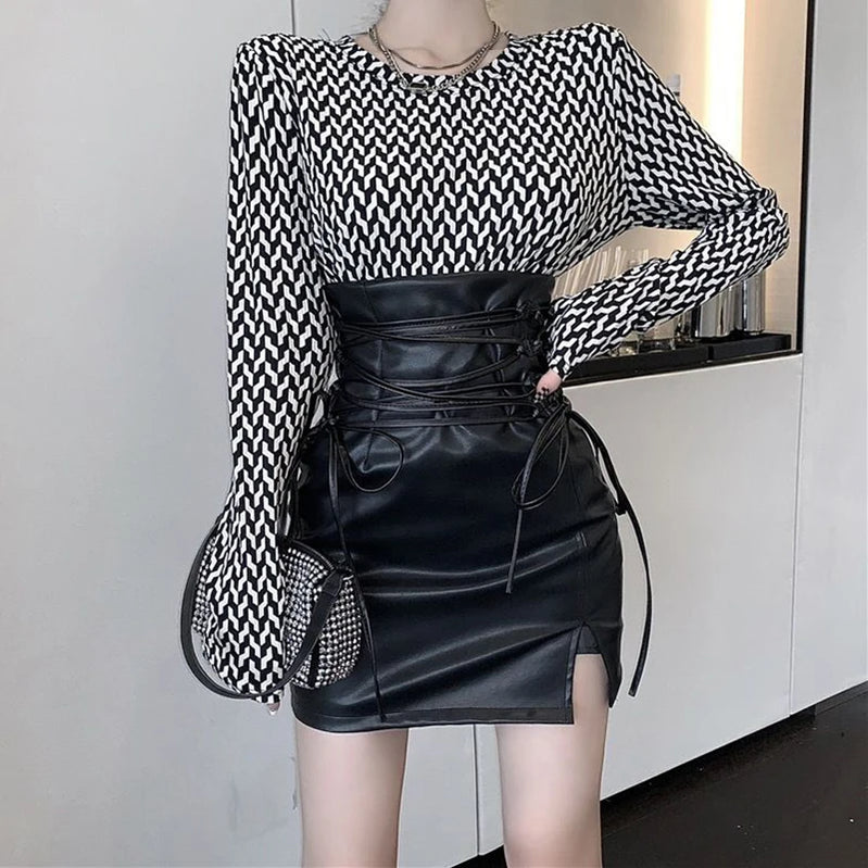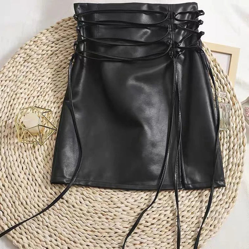 Mini saias de couro sintético preto para mulheres, sexy, cintura alta, justa, com cadarço, saia lápis feminina, gótica, para clube, saias de quadril