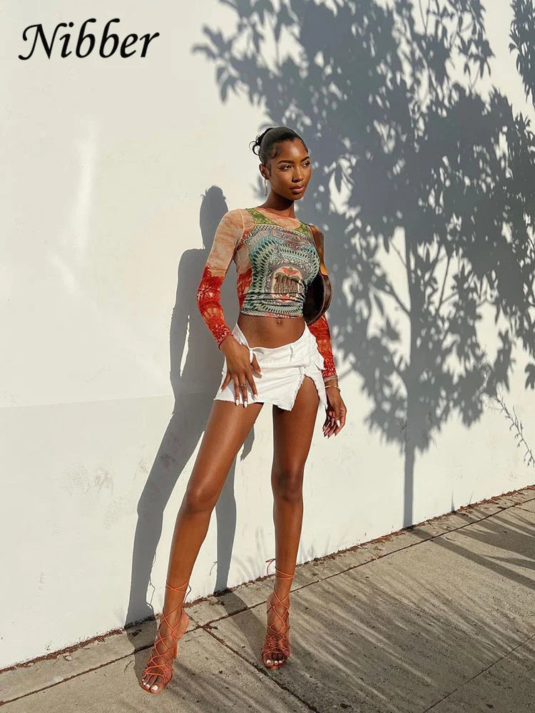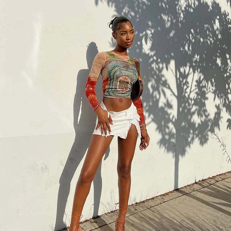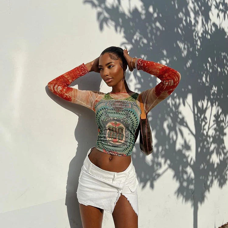 Outono arte impressão camiseta feminina wear manga comprida o pescoço seção curta umbigo fino ajuste superior feminino rua conforto roupas