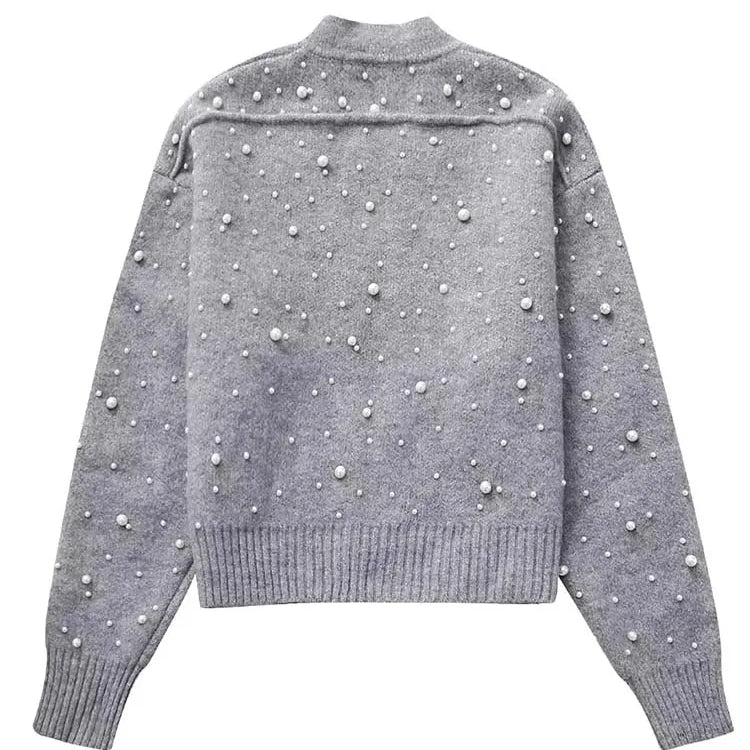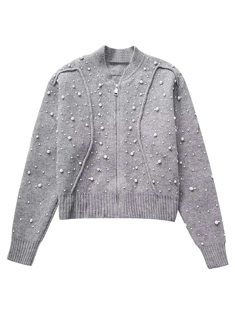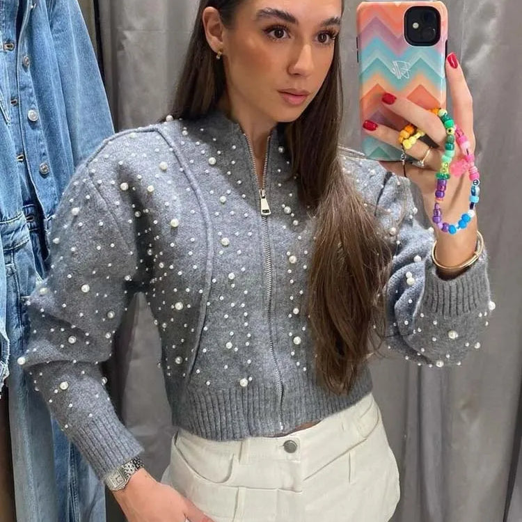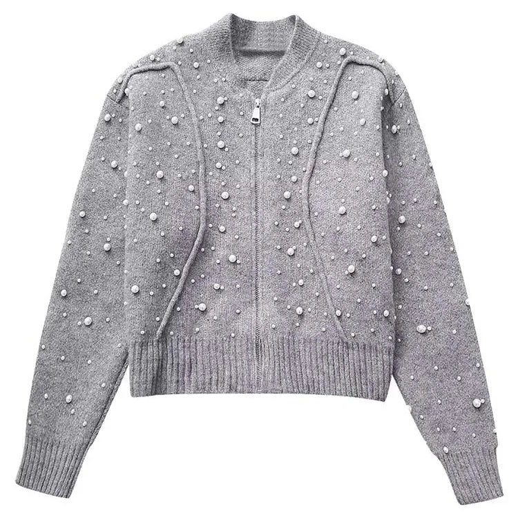 Pérolas artificiais cortadas jaqueta feminina casaco de malha mulher manga longa outono bombardeiro jaquetas para mulheres casacos curtos