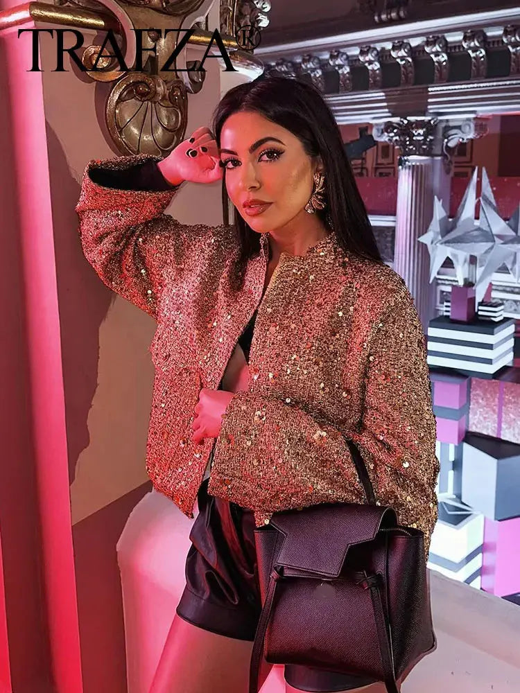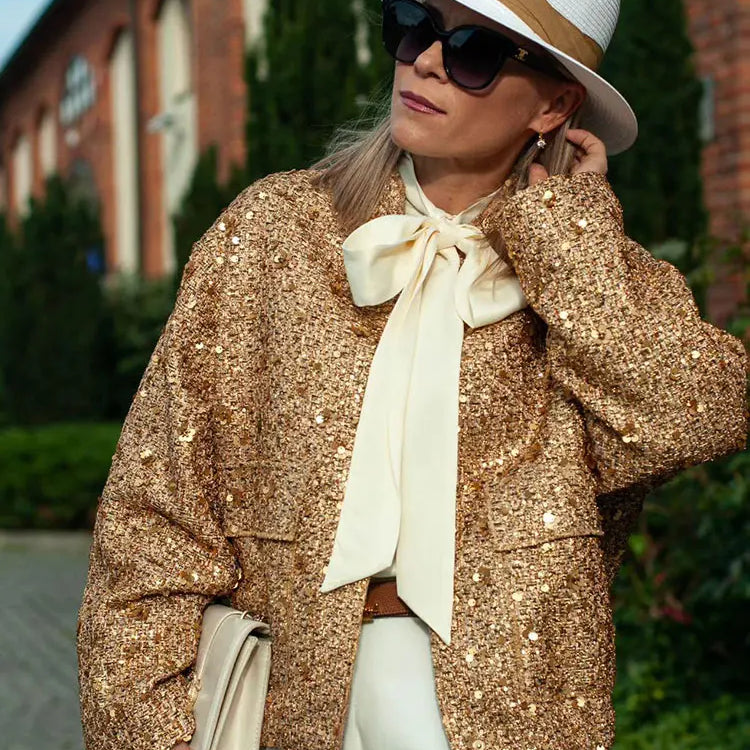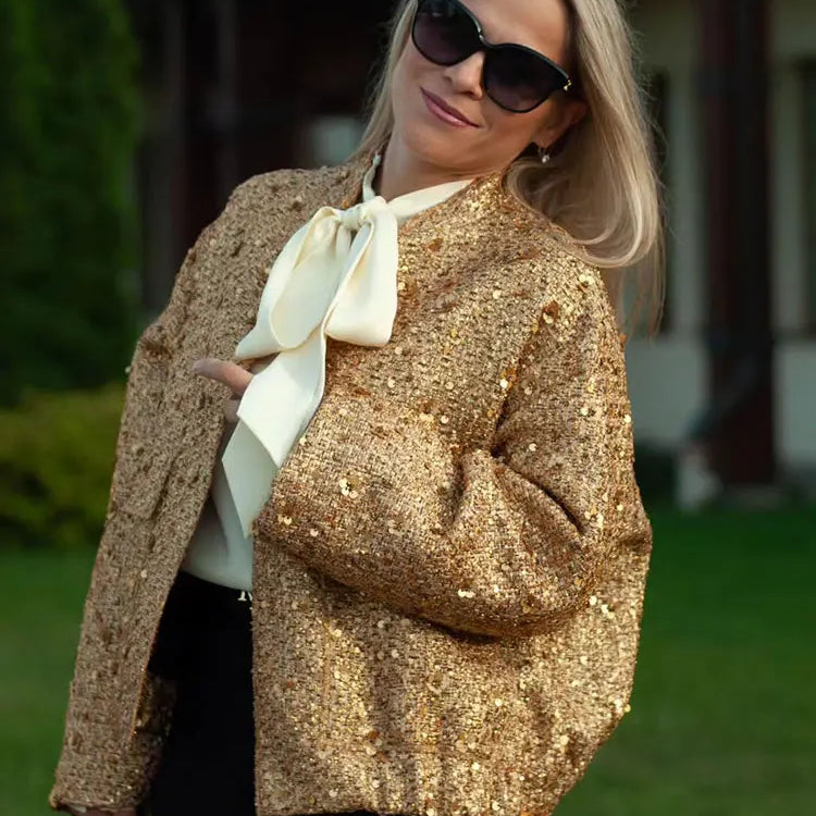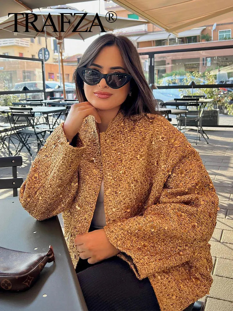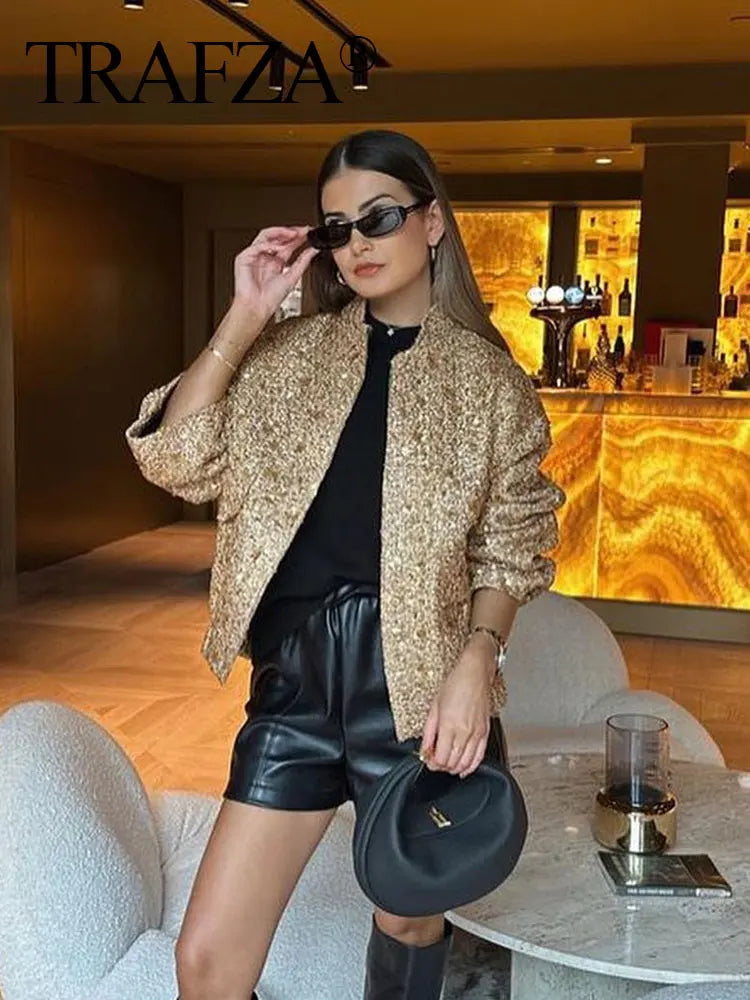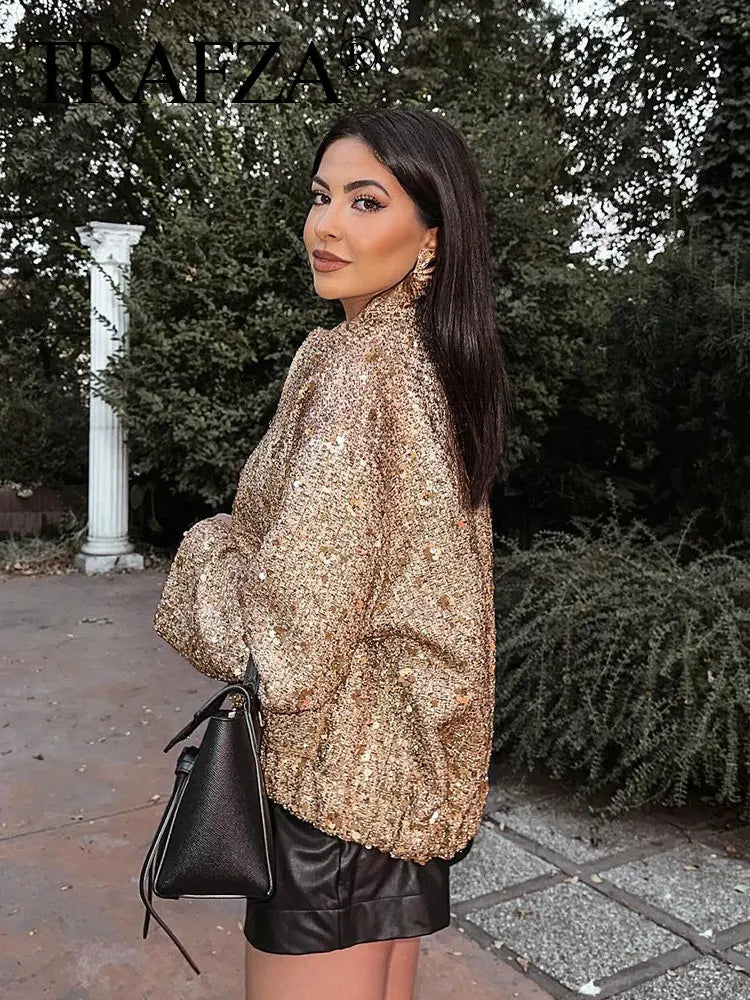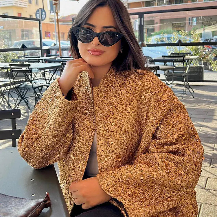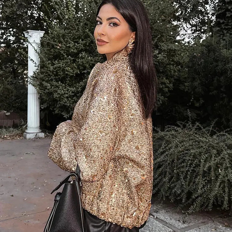 Casaco de outono para mulheres, moda feminina, lantejoulas douradas, gola alta, manga comprida, solto, curto, jaqueta feminina com pregas