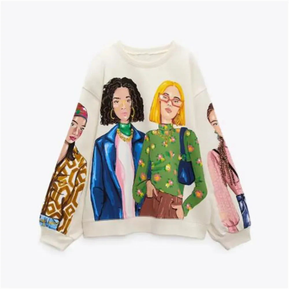 Suéter feminino casual, solto, versátil, gola redonda, manga comprida, estampado, outono/inverno