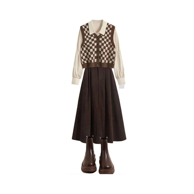 Outono e inverno feminino conjunto vintage xadrez colete camisa meio comprimento estilo britânico casaco de três peças/peça única