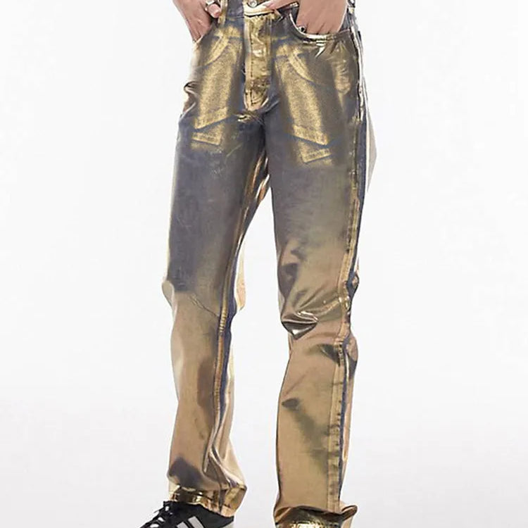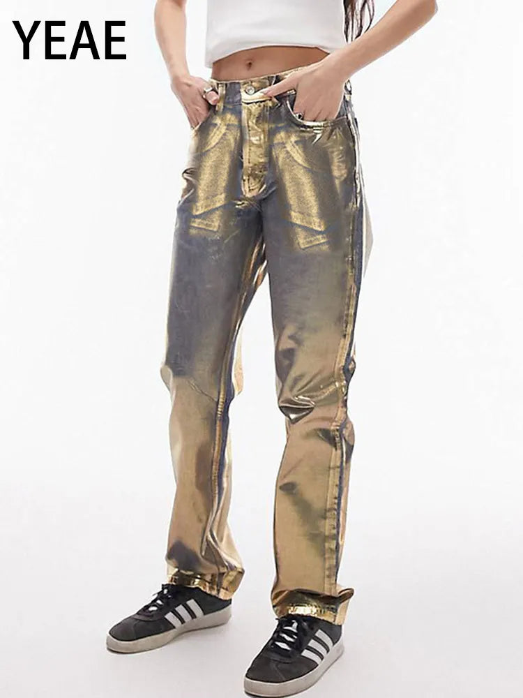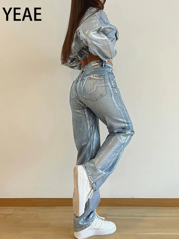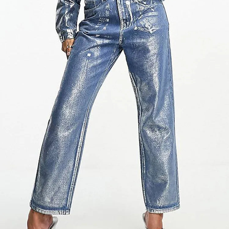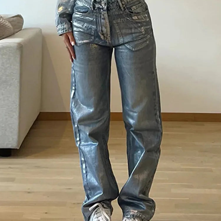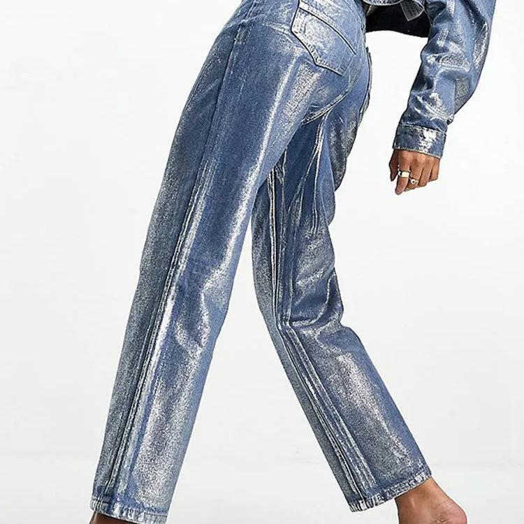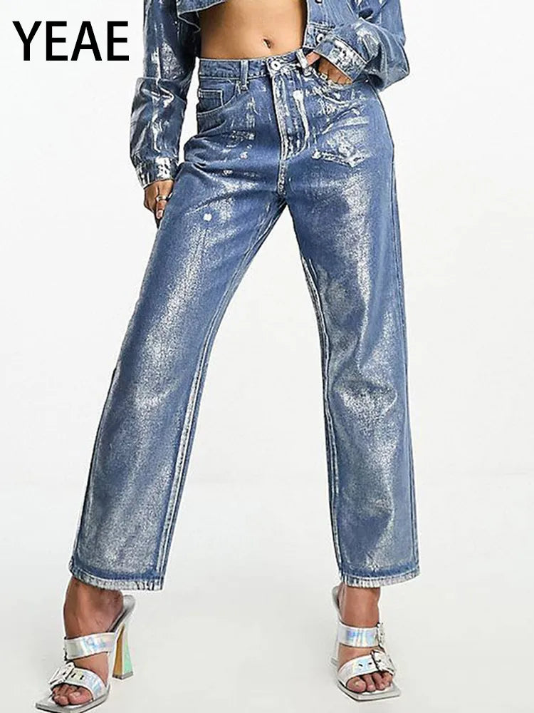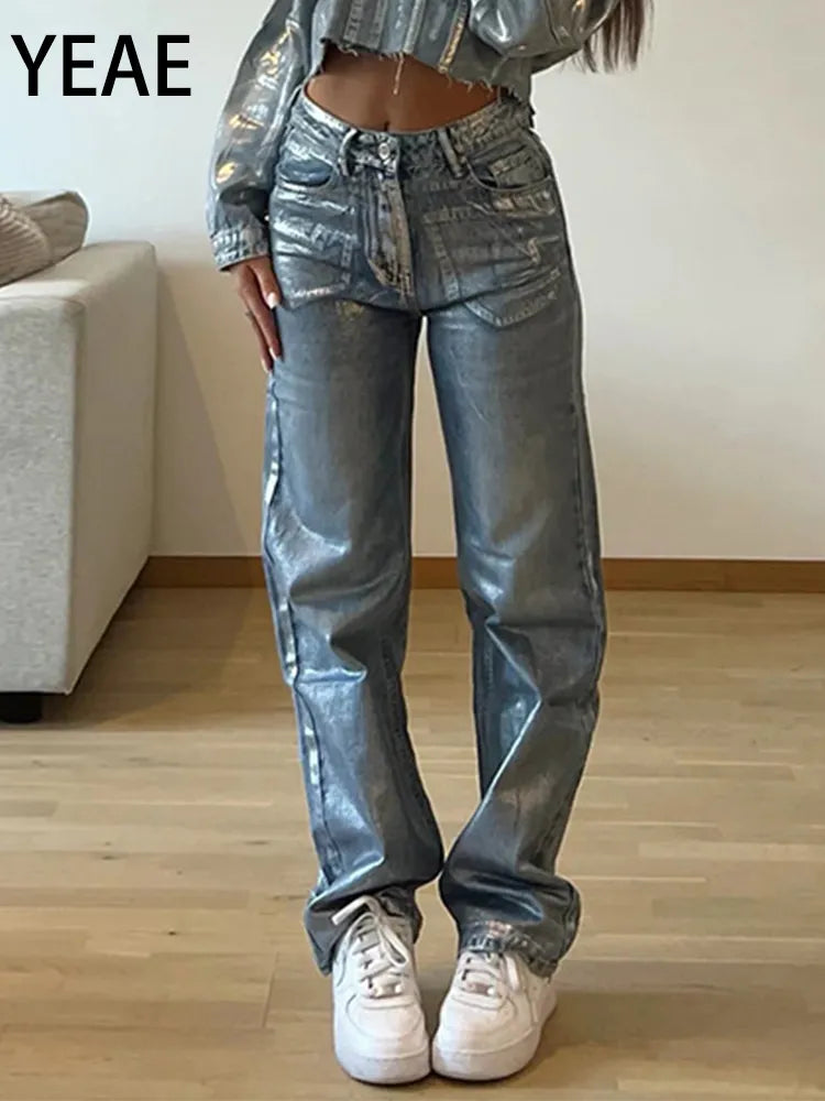 Calça jeans reta americana metálica de cintura alta feminina, estampada, solta, perna larga, para festa e balada