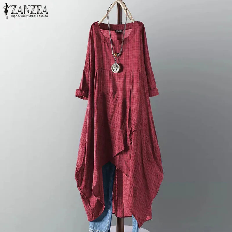 Vestido midi assimétrico feminino xadrez manga comprida vestido de verão camisa casual robe