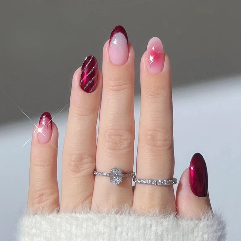 24Pcs Retro Press on Fake Nails Almond Oval Gold Star Nails Patch with Studded Diamond designs Detachable Cool Manicure Art Set